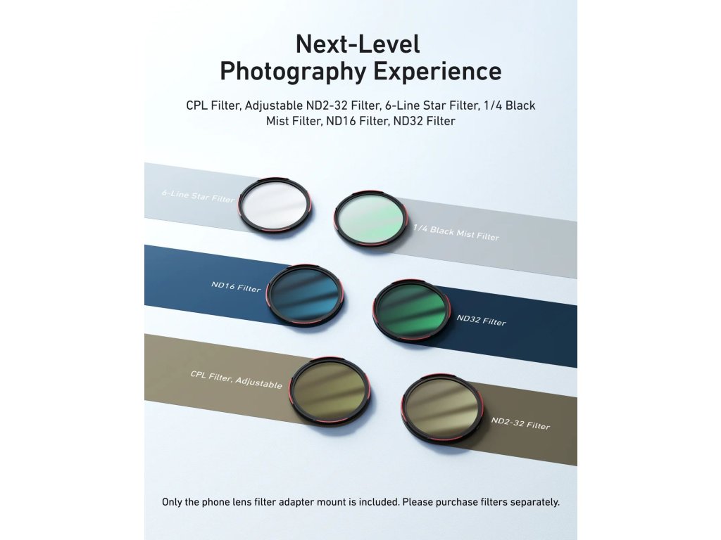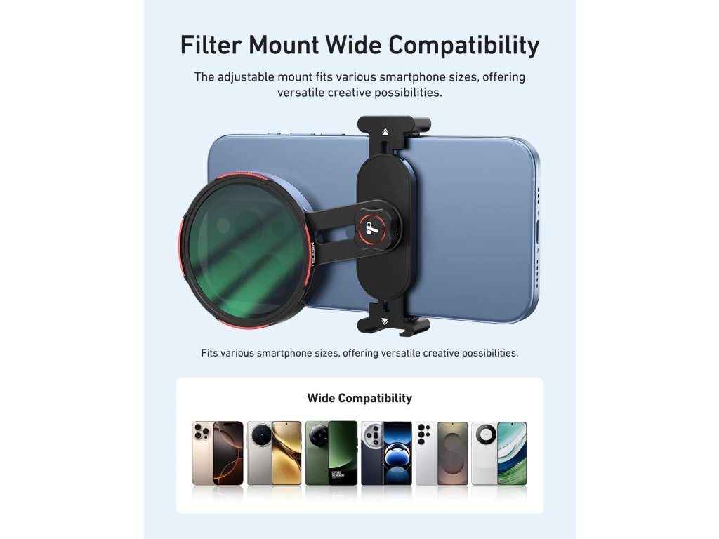 Rozšiřte možnosti svého mobilního focení. TELESIN 67mm univerzální držák filtrů umožňuje používat profesionální fotografické filtry přímo na vašem smartphonu. Ať už chcete dosáhnout jemného rozostření vody, eliminovat odlesky nebo zvýraznit barvy oblohy, díky tomuto adaptéru proměníte svůj telefon v kreativní nástroj pro mobilní fotografii i video.