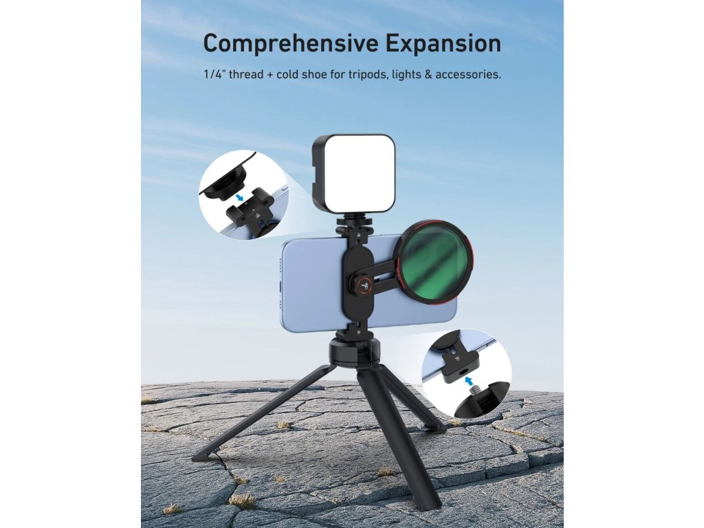 - Flexibilní polohování: rameno s jemným nastavením umožňuje přesné vycentrování filtru před objektivem telefonu.