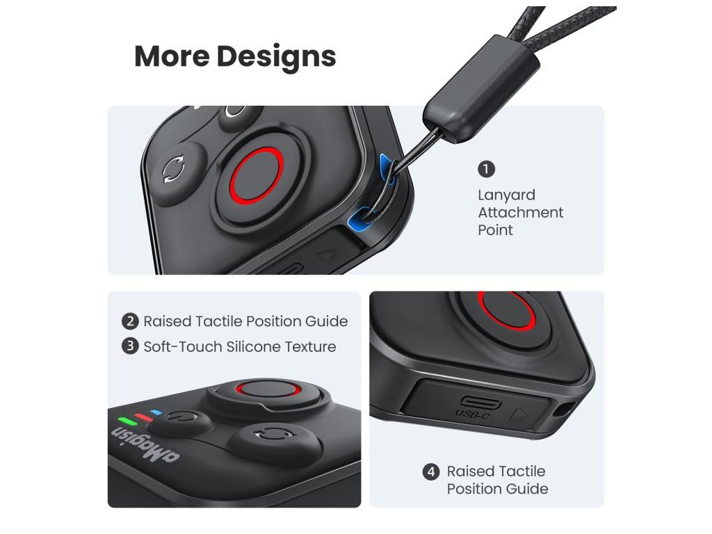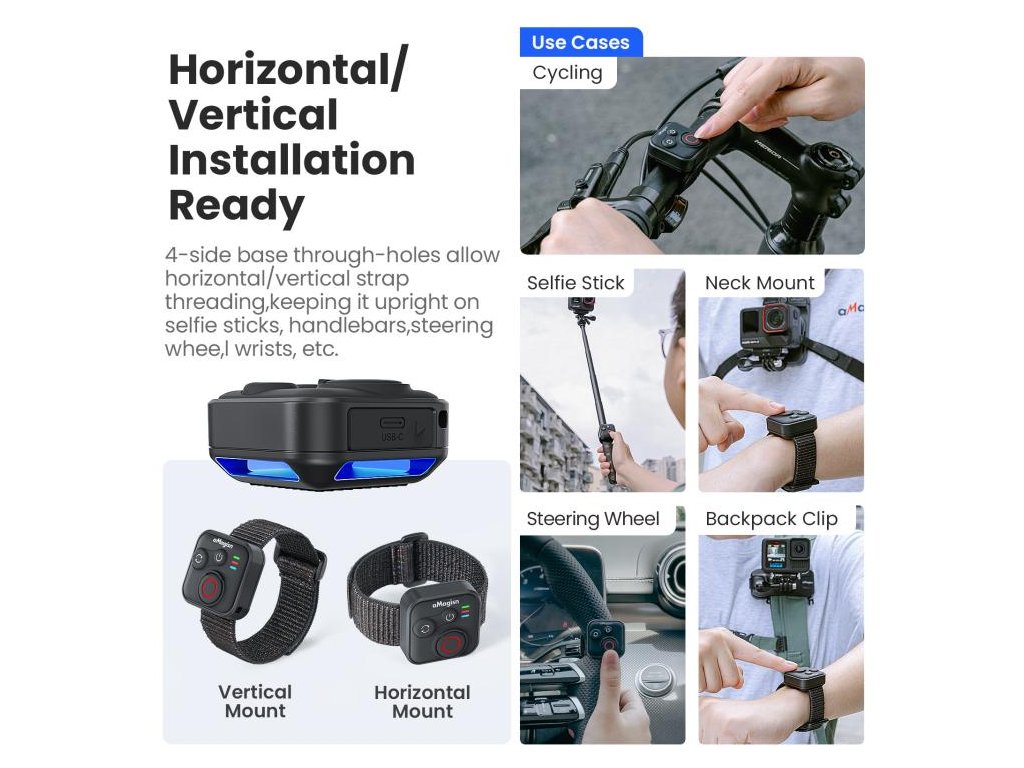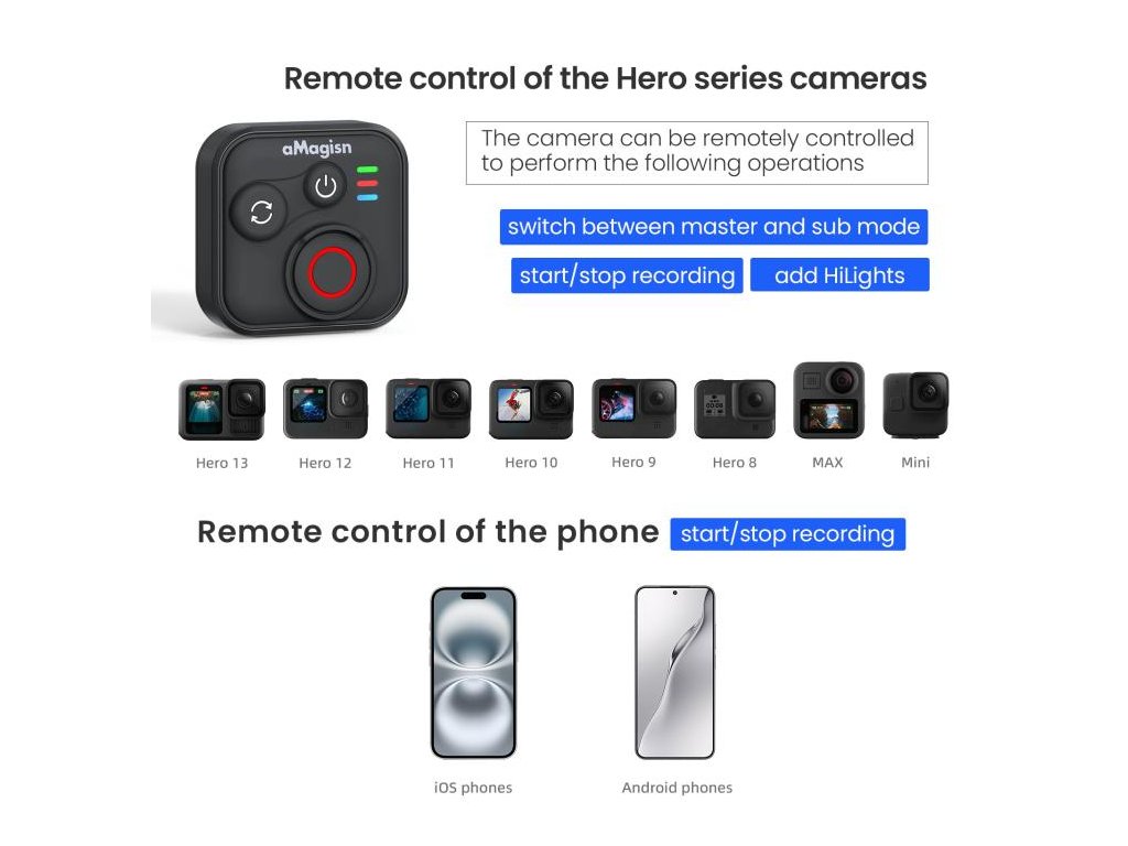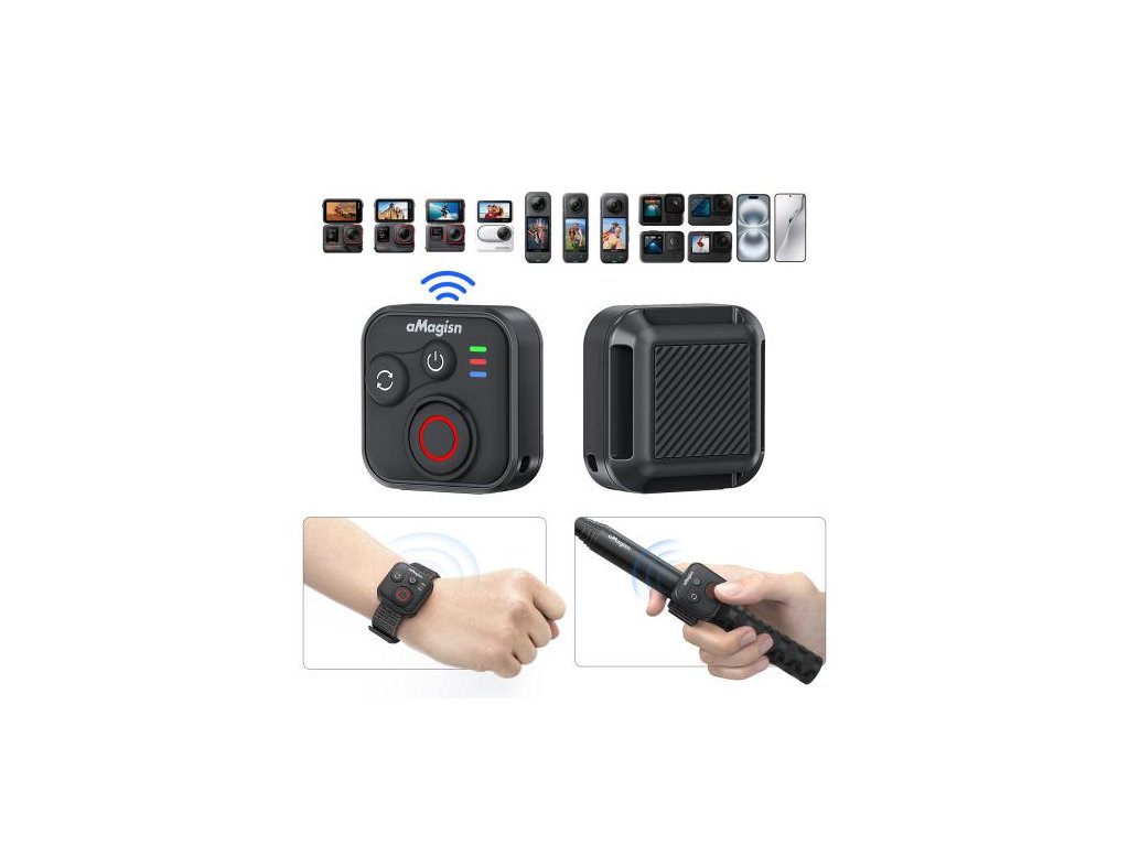 Bezdrátový dálkový ovladač aMagisn umožní ovládat akční kamery i chytré telefony na dálku bez nutnosti sahat na zařízení. Přes Bluetooth nabízí bezdrátové ovládání až do vzdálenosti 50 m a je kompatibilní s kamerami řady Insta360, kamerami řady GoPro HERO i se smartphony iOS/Android. Hodí se pro situace, kdy potřebujete spustit záznam „na dálku“ – na stativu, na selfie tyči, na řídítkách nebo při skupinových záběrech.