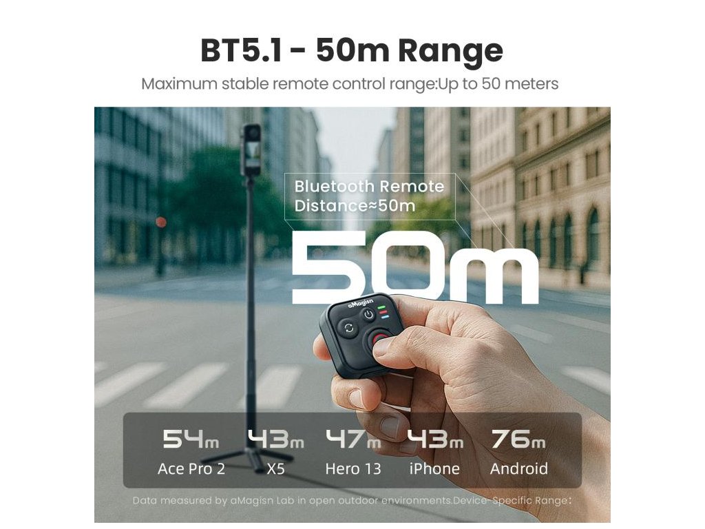 - Univerzální Bluetooth ovladač: dosah bezdrátového ovládání až 50 m, kompatibilita s kamerami Insta360, GoPro HERO a smartphony iOS/Android.