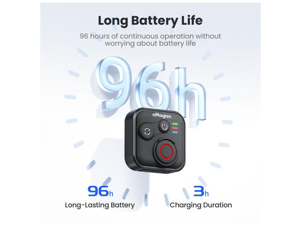 - Dlouhá výdrž: až 96 hodin provozu na jedno nabití (dle testu aMagisn Lab při spárování s kamerou Insta360 na selfie tyči).