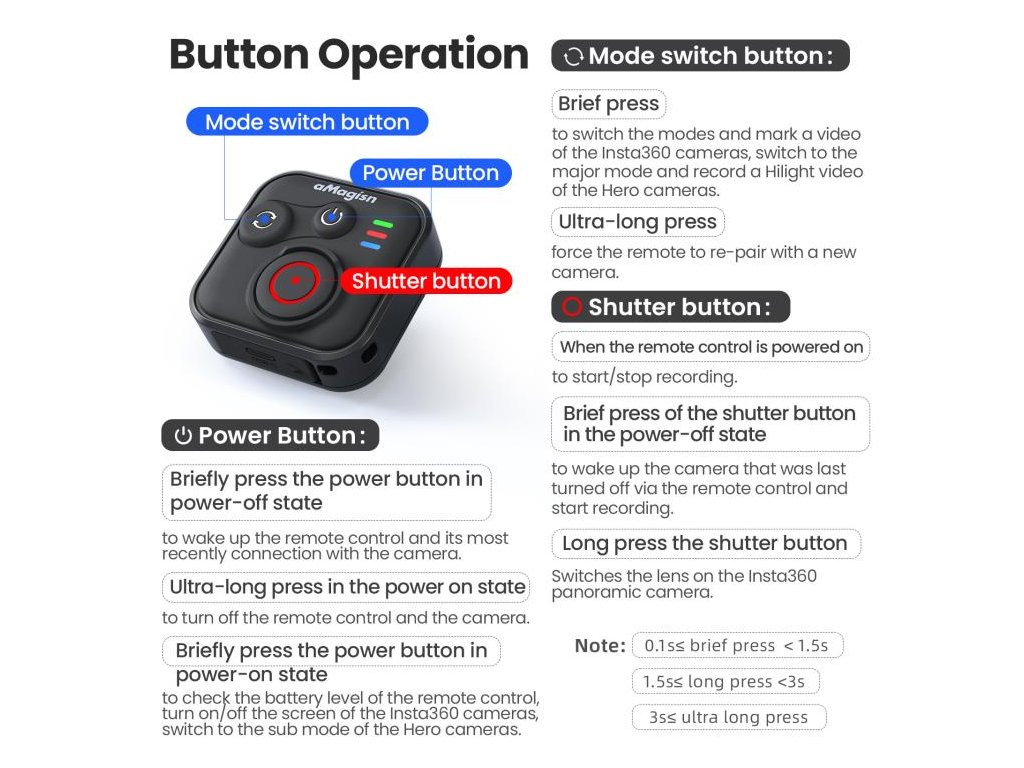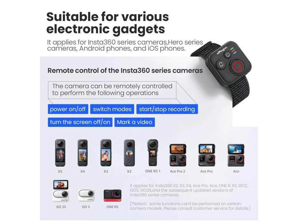- Ovládání kamer Insta360: zapnutí/vypnutí, přepínání režimů, start/stop záznamu, probuzení/uspání obrazovky, označování videa (poznámka: dostupnost funkcí se liší podle modelu kamery).
