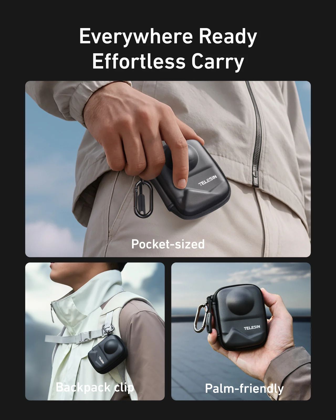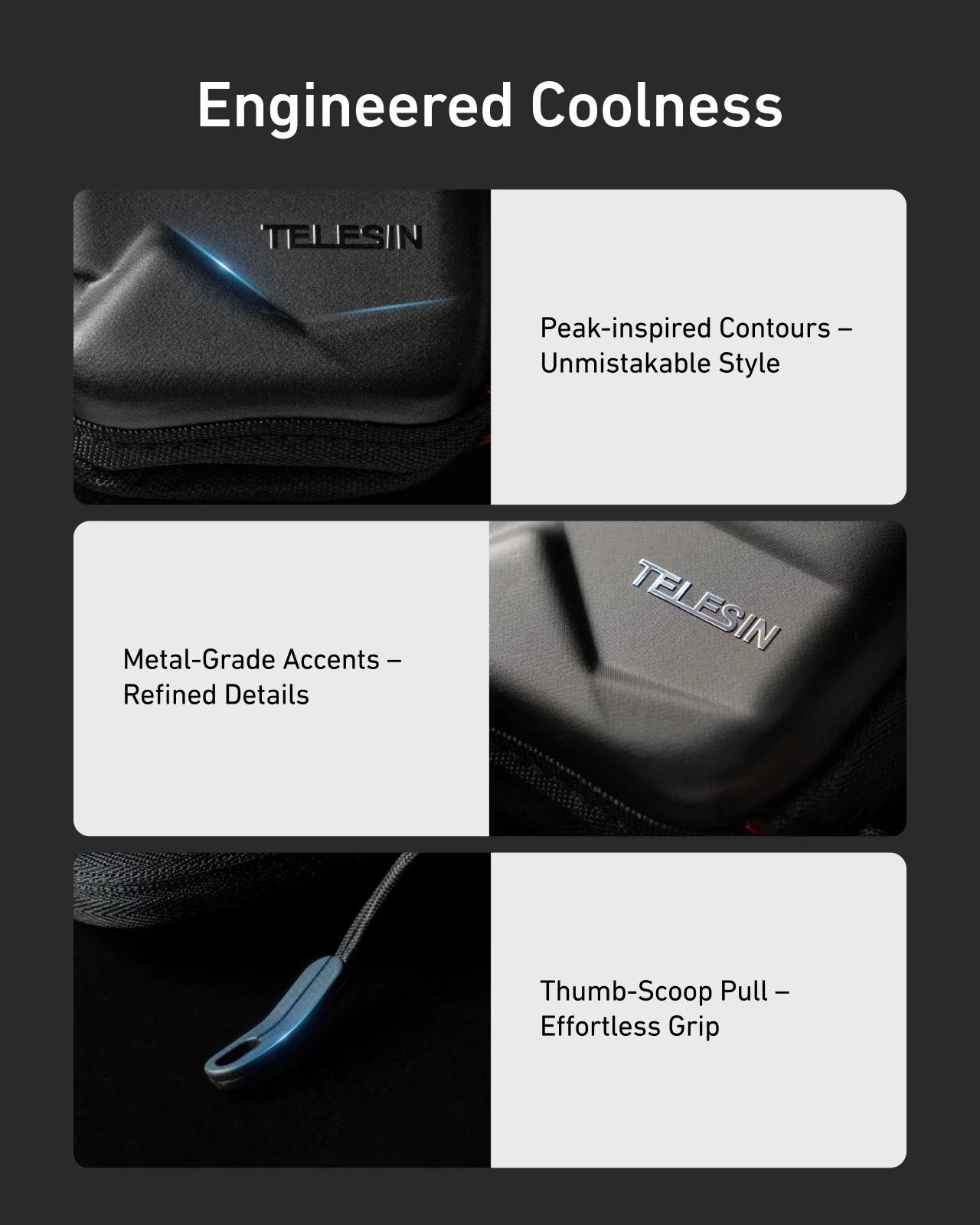- Stylový vzhled: černé provedení s decentním logem TELESIN a červeným zipem působí elegantně i funkčně.