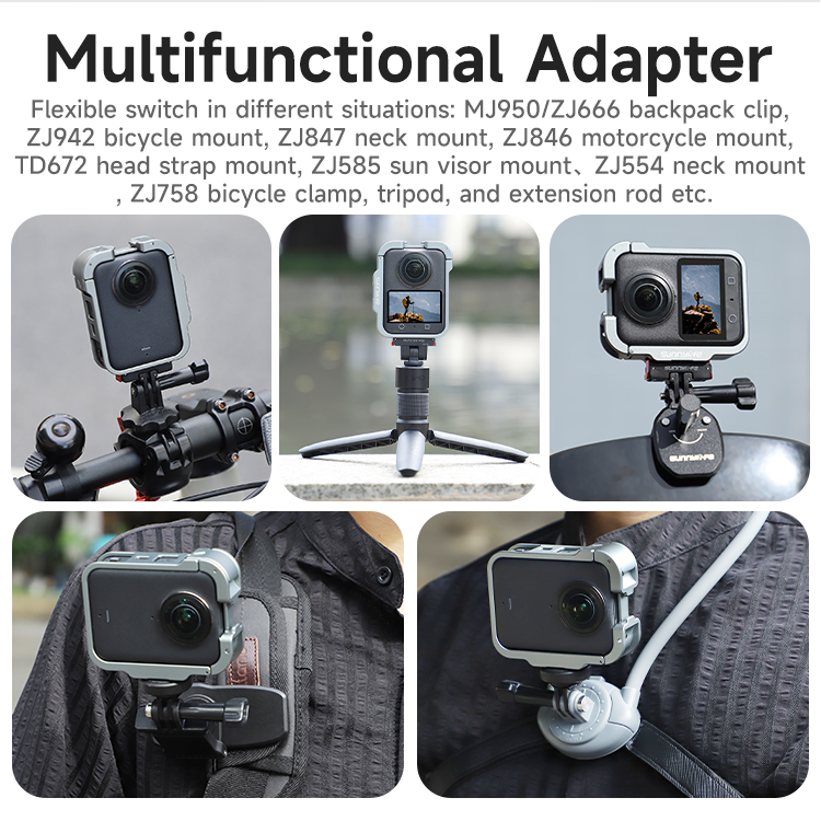 - Široká kompatibilita montážních systémů: Rám lze použít s MJ950/ZJ666 backpack clip, ZJ942 držákem na kolo, ZJ847 nákrčním držákem, ZJ846 držákem na motorku, TD672 popruhem na hlavu, ZJ585 držákem na sluneční clonu, ZJ554 nákrčním držákem, ZJ758 svěrkou na kolo, stativem či prodlužovací tyčí.