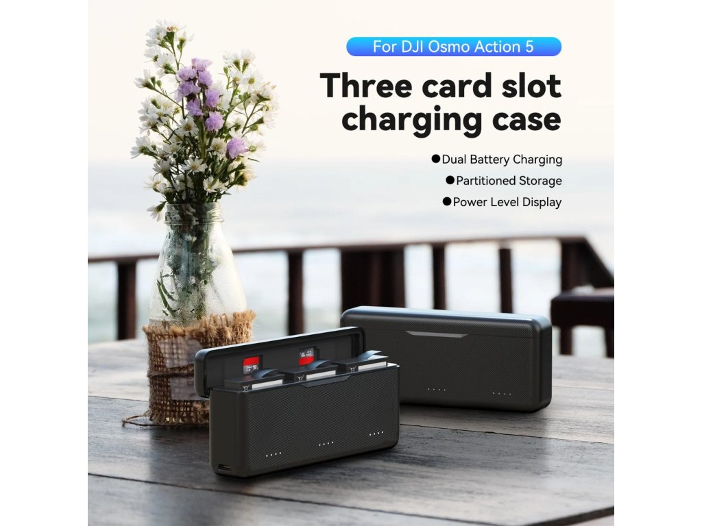 Multi nabíječka BOX pro DJI Action 5 Pro a Action 4 je chytré řešení 3 v 1 – rychlé dobíjení, bezpečné uložení baterií a zároveň prostor pro dvě microSD karty. Vše na jednom místě, kompaktně a připraveno k akci.