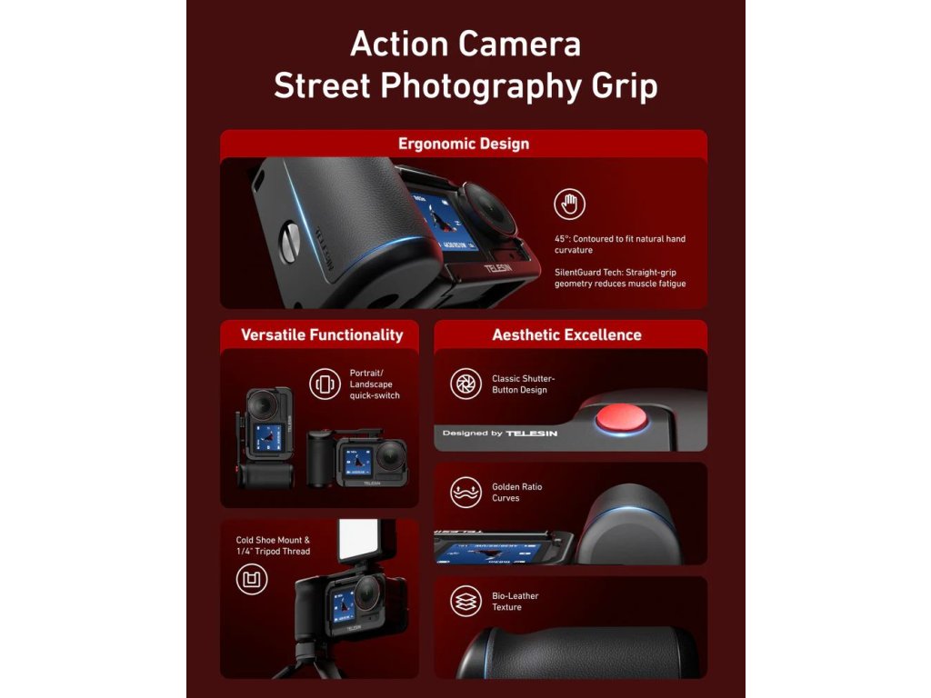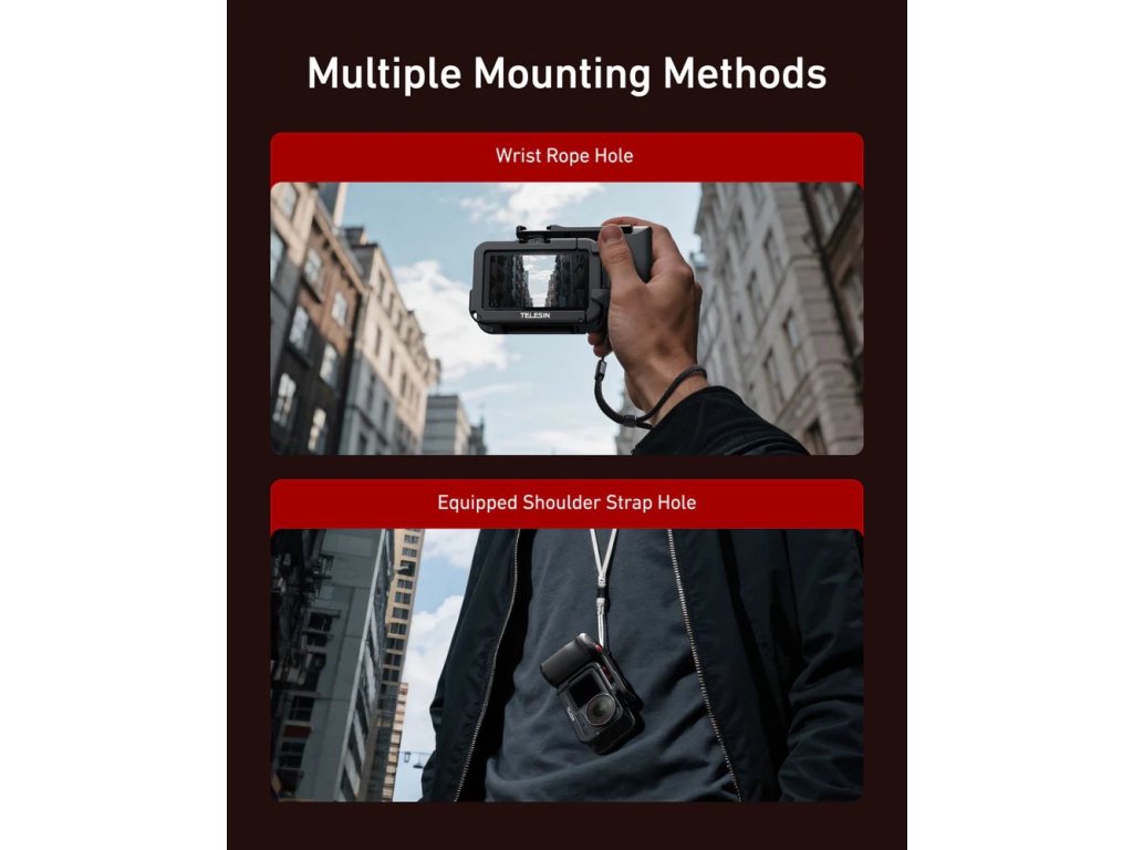 Profesionální úchop, bezpečí a kontrola v jednom. StreetGrip od TELESIN promění vaši DJI Action kameru ve skutečný filmový nástroj. Kombinuje ergonomické madlo s precizní ochrannou klecí, takže máte při natáčení naprostou jistotu, pohodlí i styl. Ideální pro vlogery, street tvůrce a každého, kdo natáčí v pohybu.