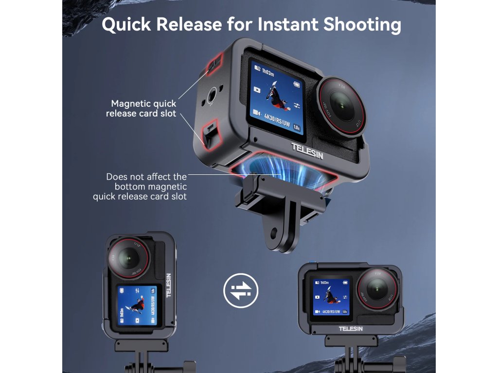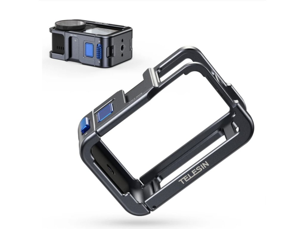 TELESIN Multi-funkční klec je navržena pro kamery DJI Action 3, 4 a 5 Pro, poskytuje ochranu a rozšiřuje možnosti montáže příslušenství.