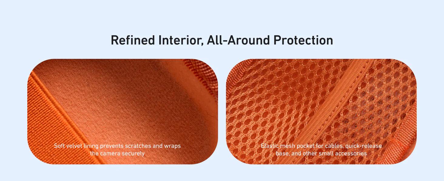 - Měkký vnitřní prostor: Polstrování chrání kameru před otřesy a zajišťuje stabilní uložení.