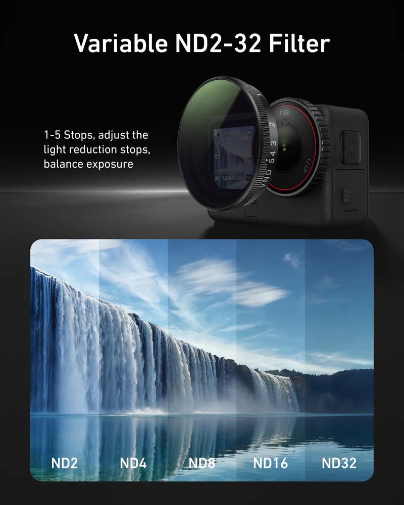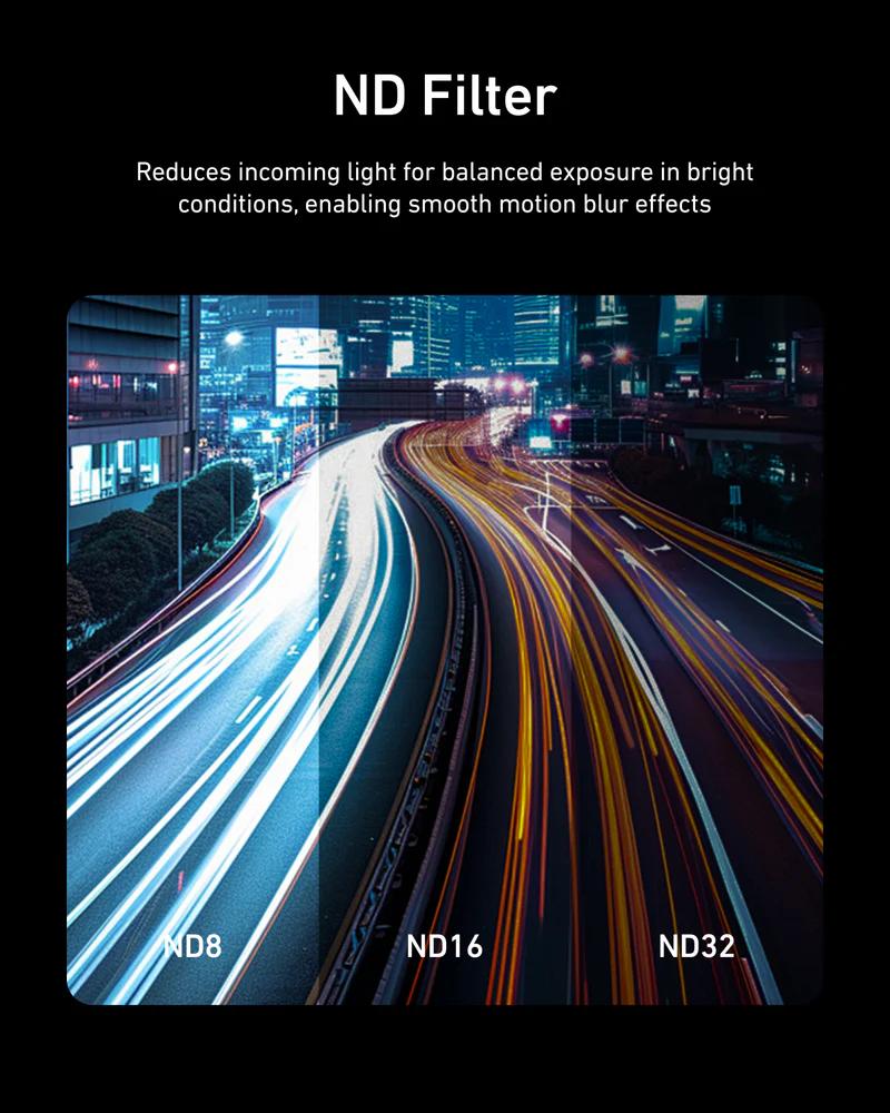 - ND8 filtr: Snižuje množství světla o 3 clony – ideální pro mírně slunečné dny a přirozené rozmazání pohybu.