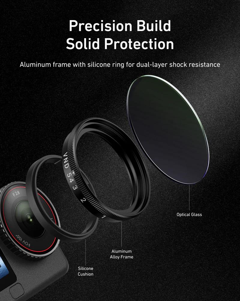 - Odolná rámová konstrukce: Lehký a pevný hliník chrání filtr a nepřidává téměř žádnou hmotnost kameře.