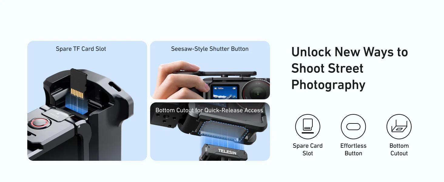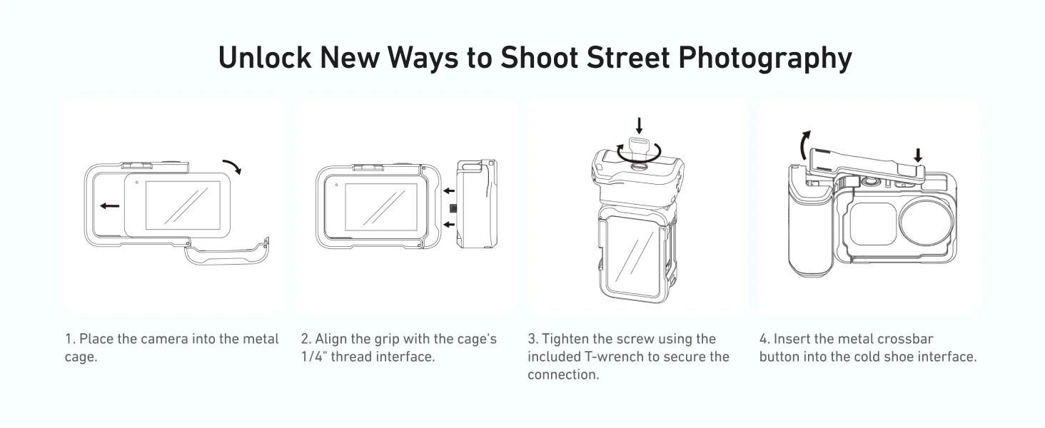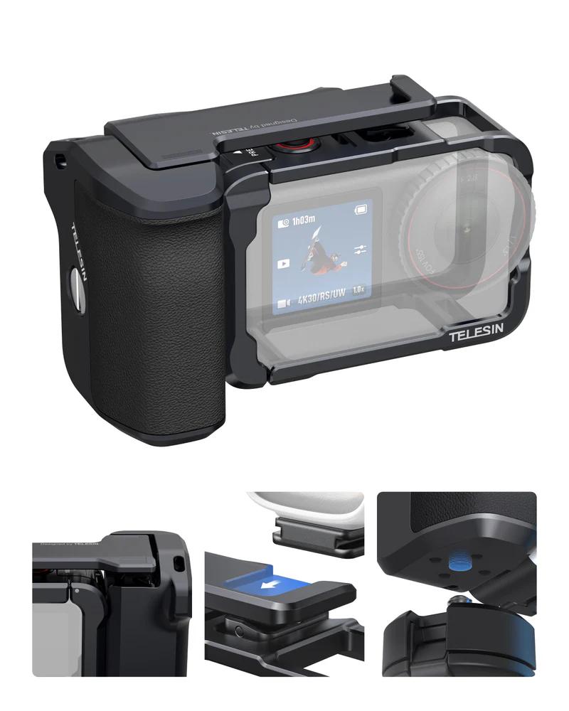 TELESIN StreetGrip Kit pro DJI Osmo Action 6 je sada hliníkové klece s ergonomickým fotografickým madlem, která zlepší stabilitu při natáčení z ruky a zpříjemní dlouhé focení i vlogování. Konstrukce je navržená přímo pro Action 6, takže kamera sedí pevně a ovládání zůstává praktické i při práci v terénu.