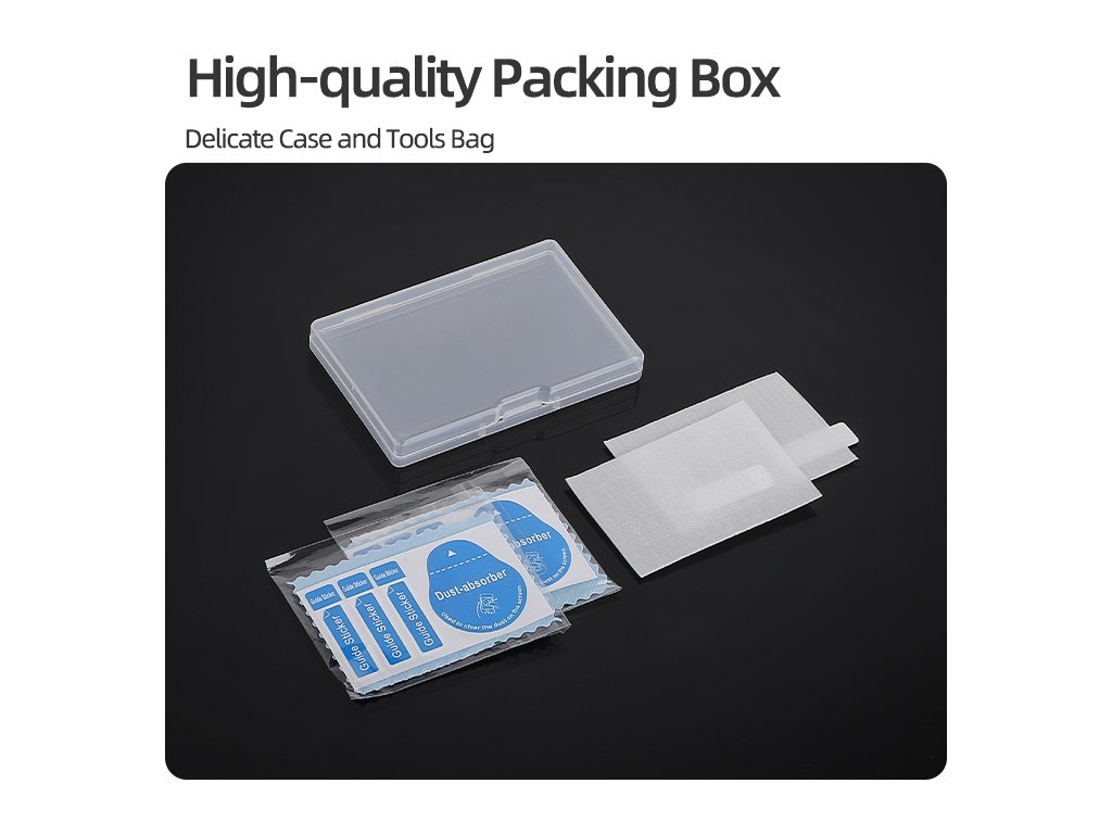 2× ochranné tvrzené sklo, 1× ochranná krabička, čisticí ubrousky, samolepky na odstranění prachu, utěrka z mikrovlákna.