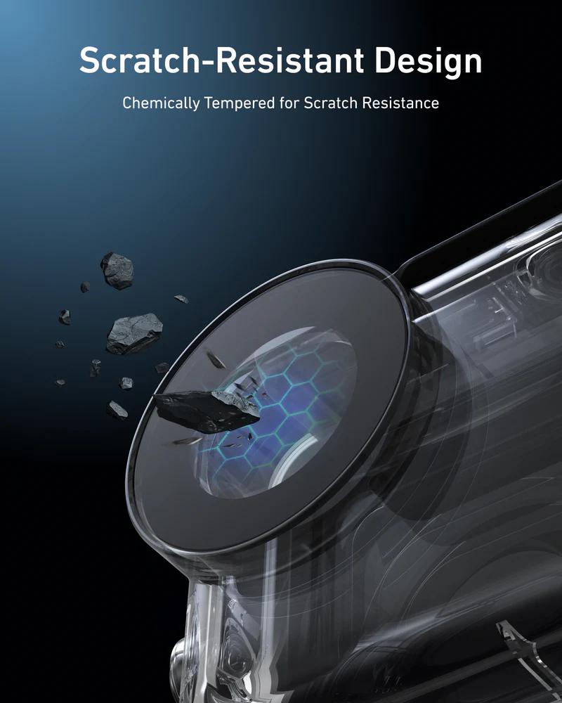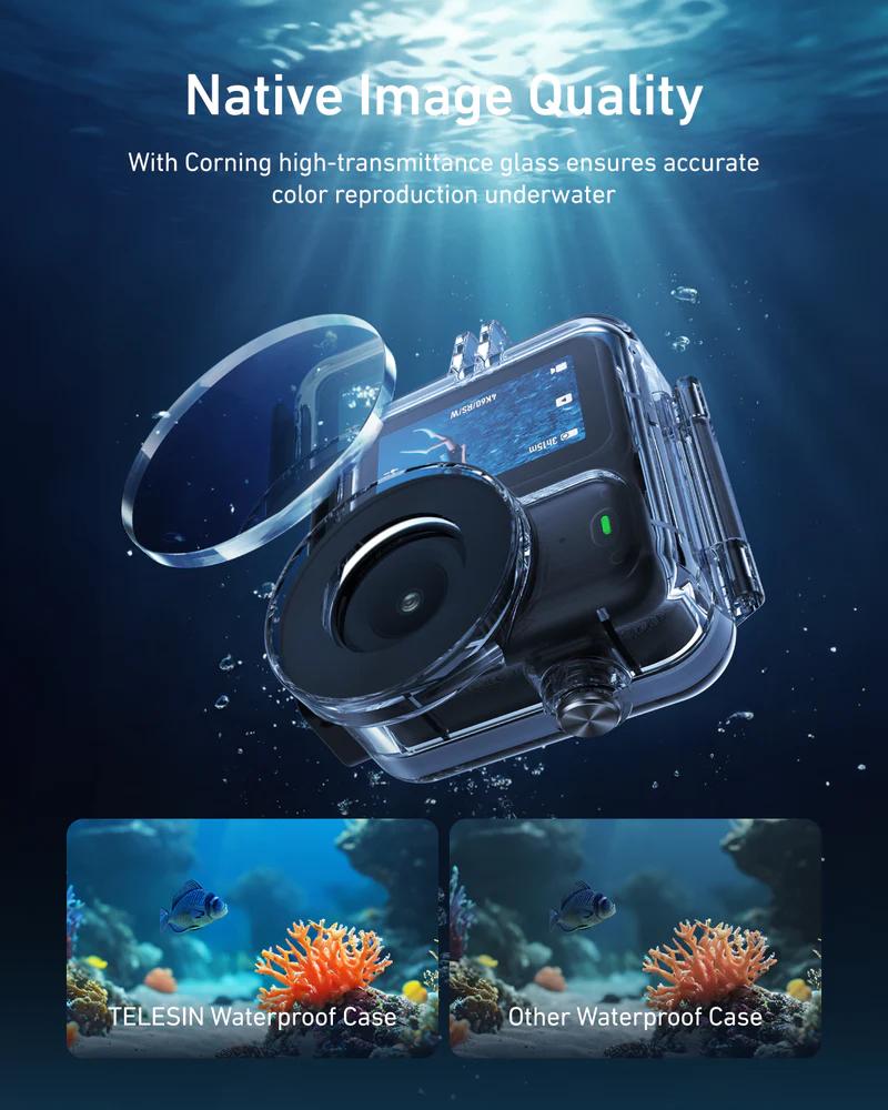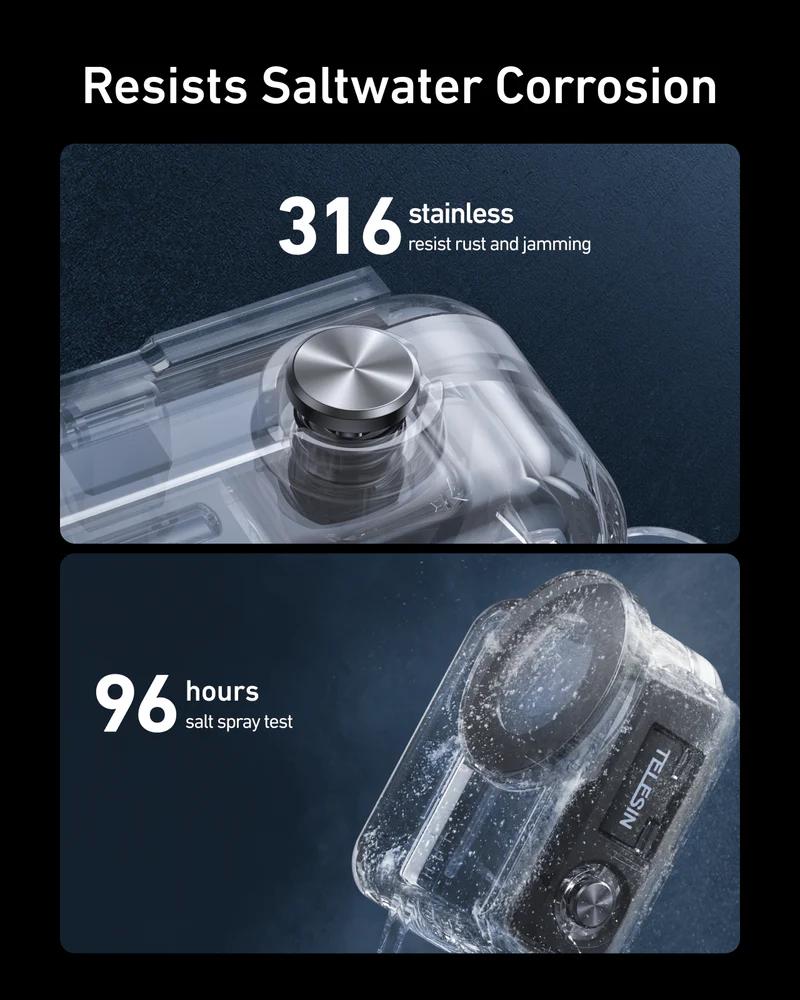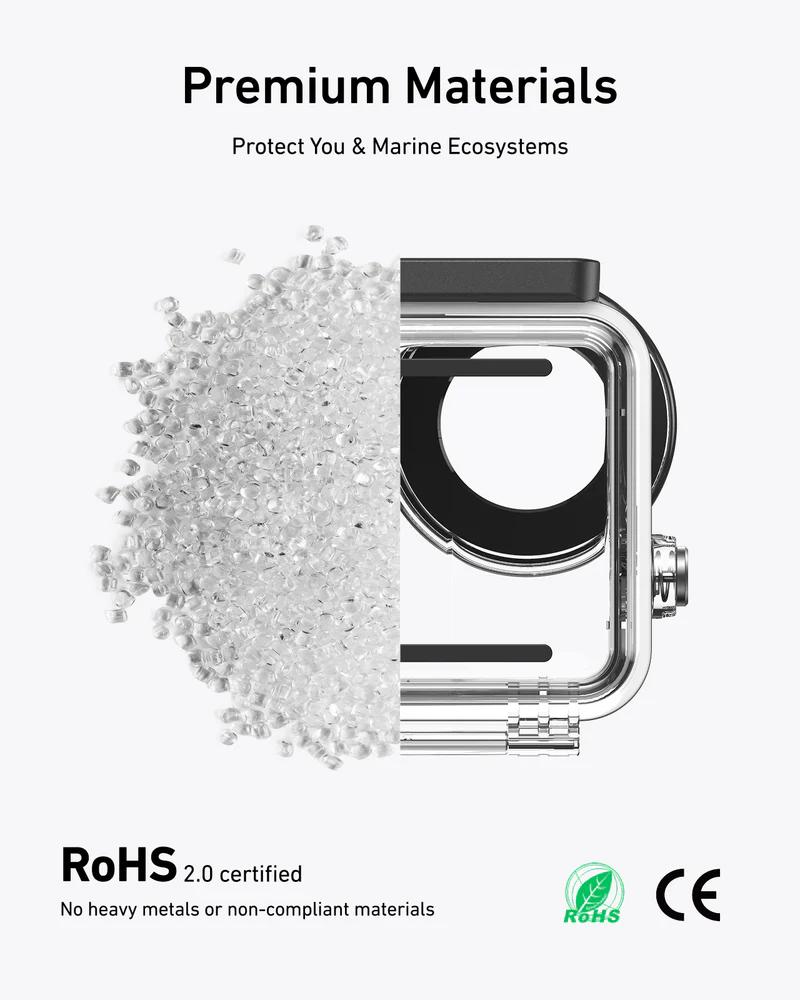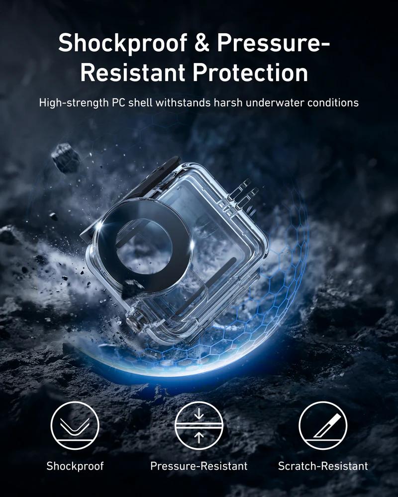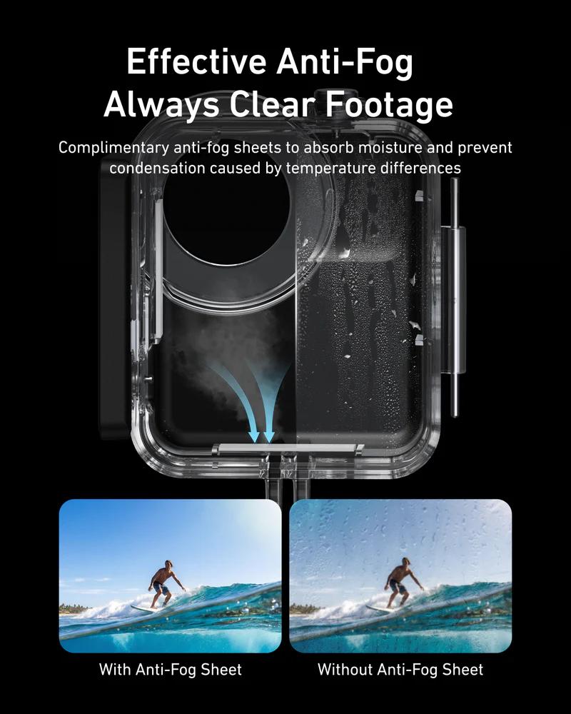 Průhledné tělo s vysokou světelnou propustností je dělané tak, aby obraz zůstal čistý i pod vodou - ať už jdete šnorchlovat, potápět se, nebo chcete kameru ochránit při surfování, sněhu a prachu. Součástí jsou také anti-fog (proti zamlžení) vložky, které pomáhají udržet výhled skrz optiku i při teplotních změnách.