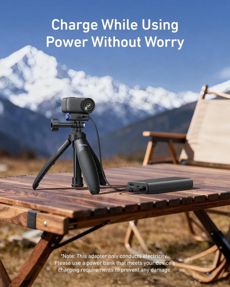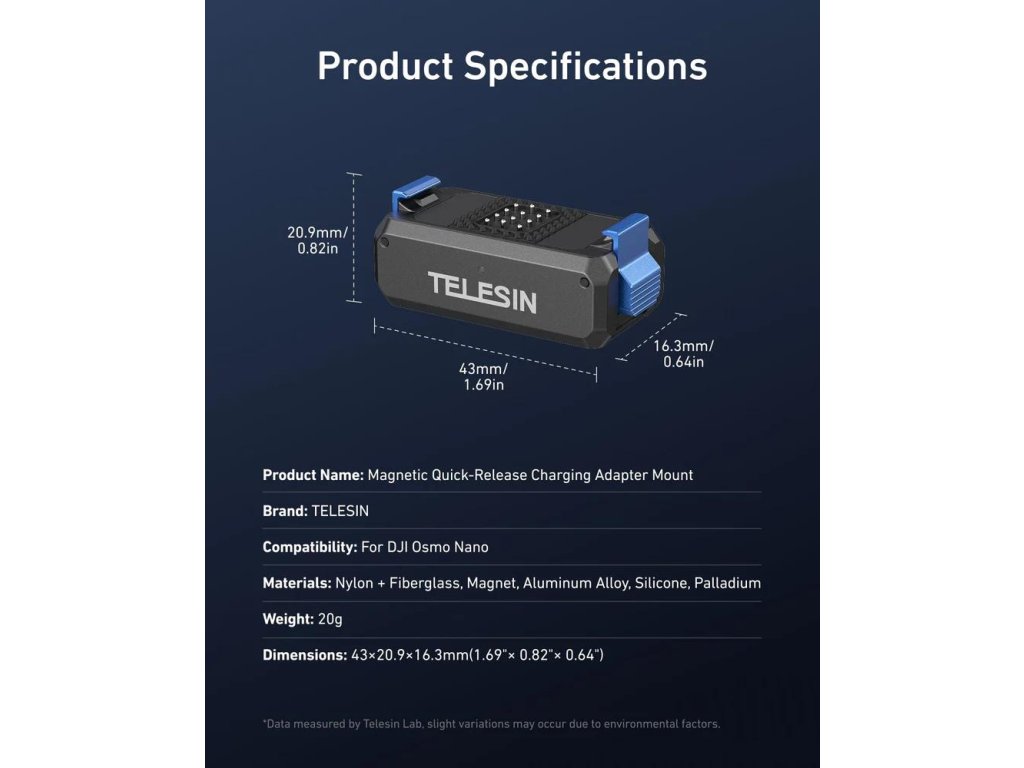 TELESIN rychloupínací USB-C nabíjecí adaptér / držák je určený pro samotnou kameru DJI Osmo Nano. Slouží jako kompaktní základna, která kameru přichytí a zároveň umožní nabíjení bez nutnosti složité manipulace – stačí kameru usadit na adaptér a připojit napájení přes USB-C.