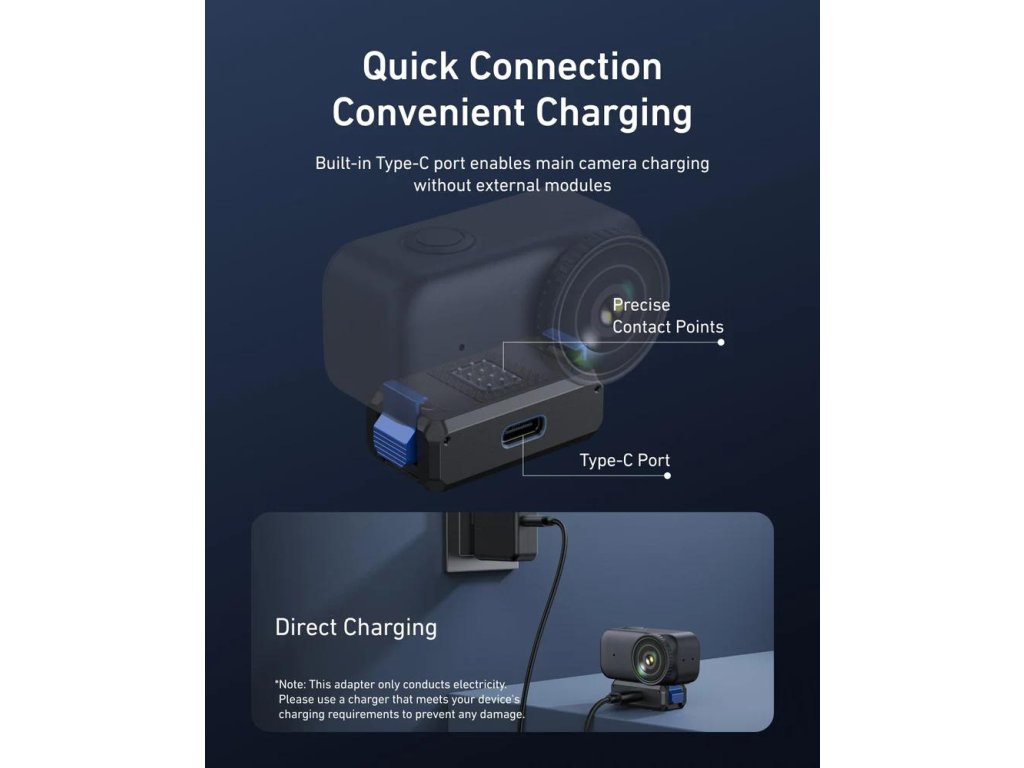 Z konstrukce je patrné nabíjecí řešení přes kontaktní piny (pogo piny) a také USB-C konektor na těle adaptéru. Spodní část je řešená jako držák ve stylu GoPro, takže se dá připojit k běžným akčním úchytům. Podle označení jde o magnetický rychloupínací adaptér, určený pro rychlé nasazení a sejmutí kamery.