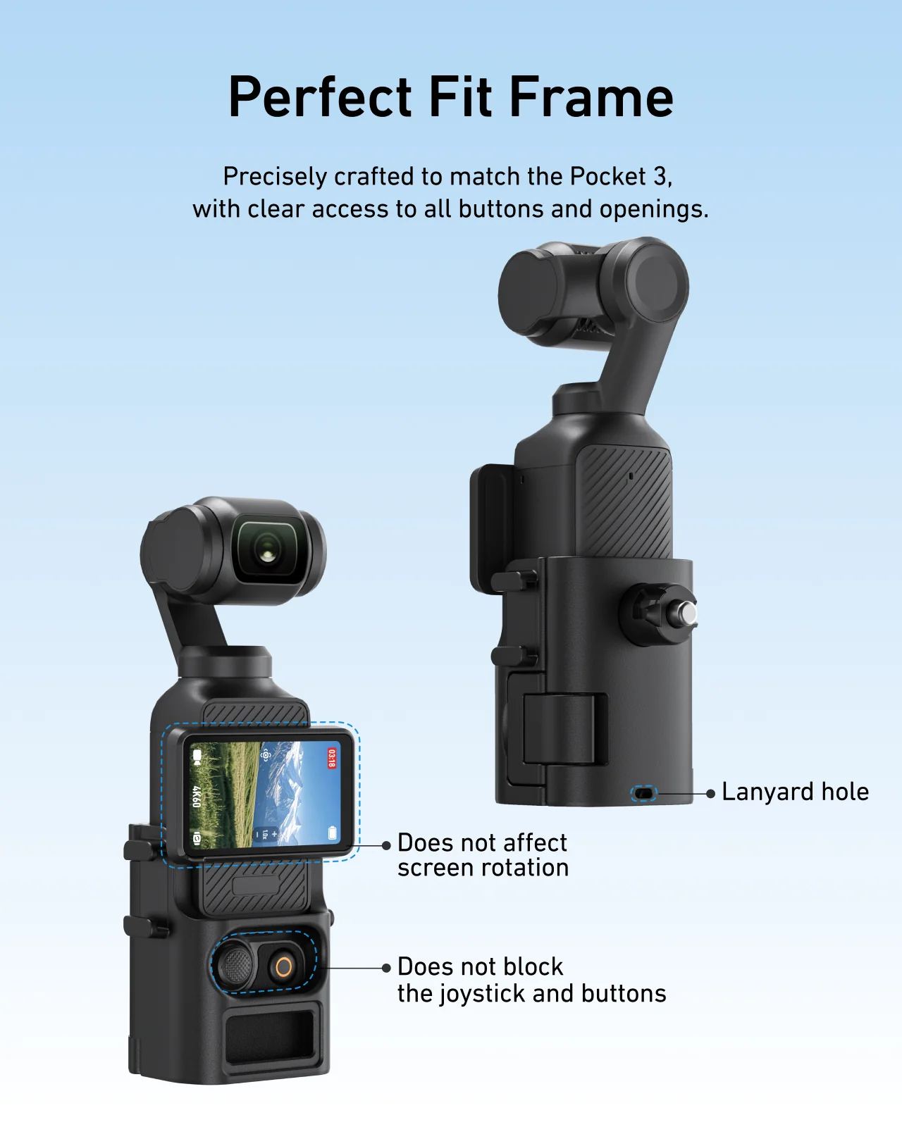 - Kompatibilita s DJI Pocket 3: přesně tvarované uchycení pro stabilní a bezpečné držení kamery bez vůlí.