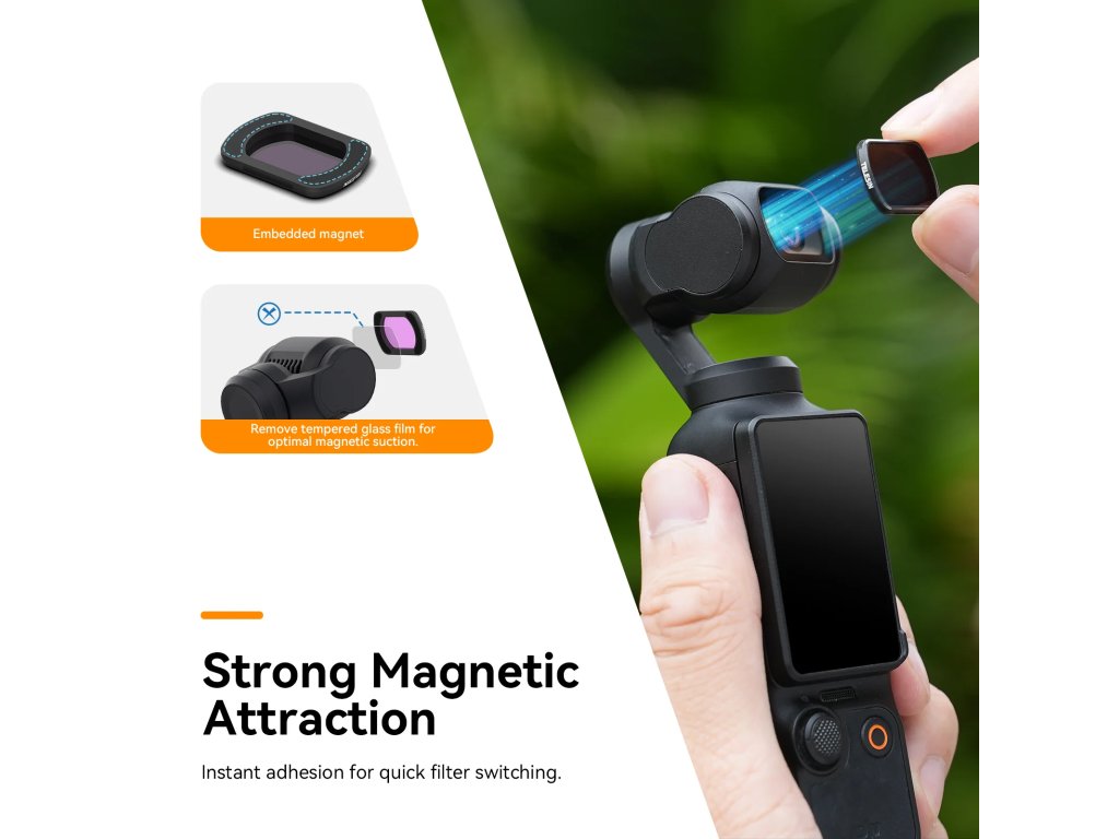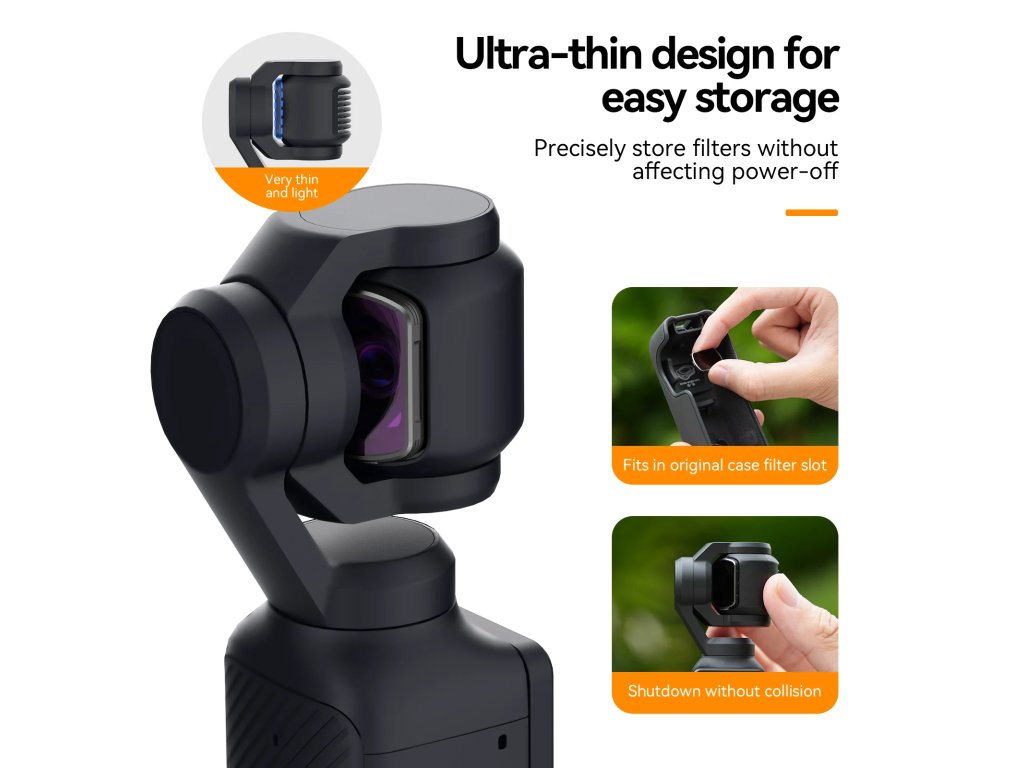 Skvělá kvalita a jedná se LOW Profile filtry, tedy nízké a kamera se s nimi umí zavřít a není tak potřeba je neustále sundávat. Sada filtrů pro DJI OSMO Pocket 3 6 v 1 ND8 + ND16 + ND32 + ND64 + ND256 + CPL