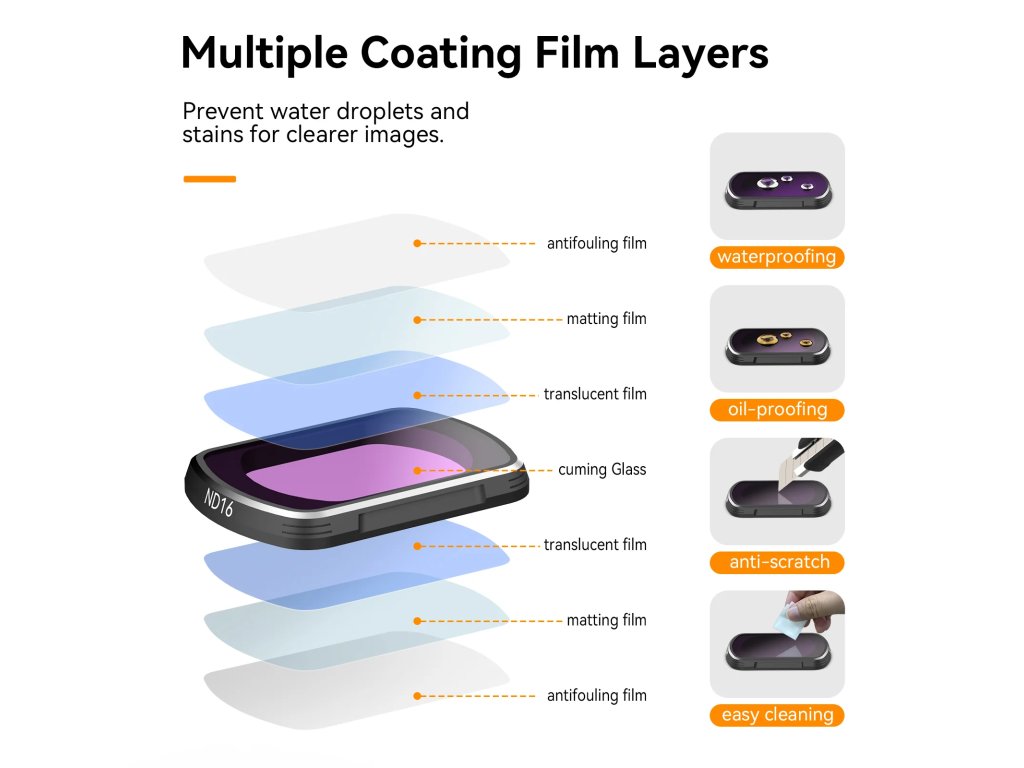 - Ochrana objektivu: Vnitřní a vnější povrchová úprava filtrů.