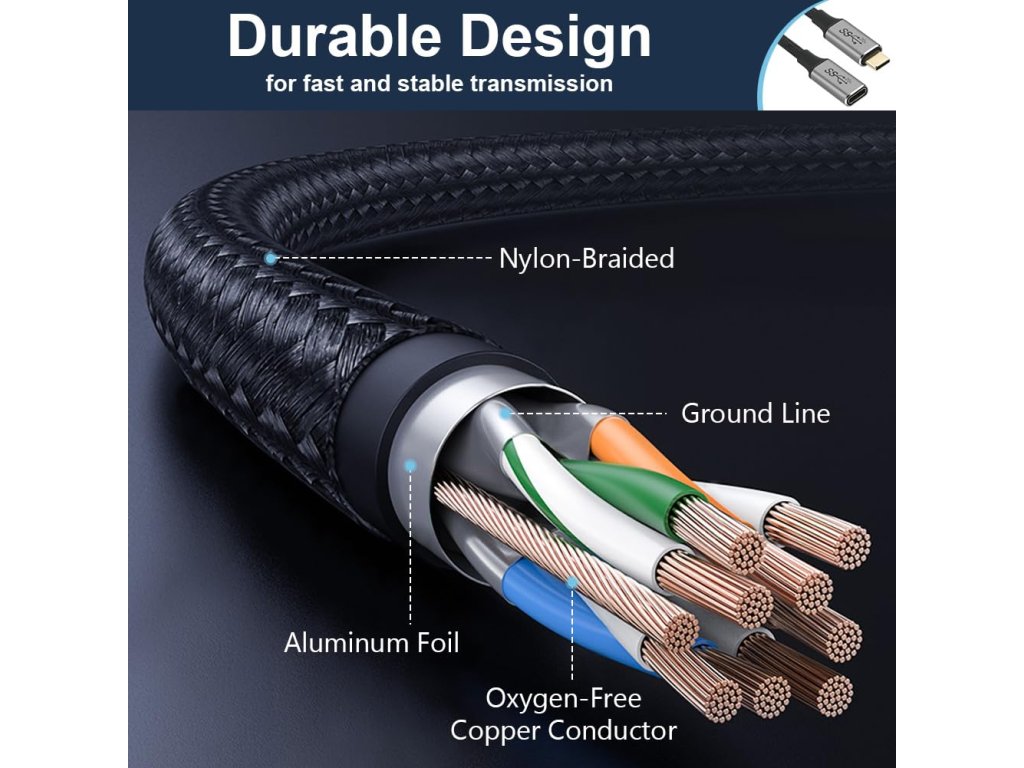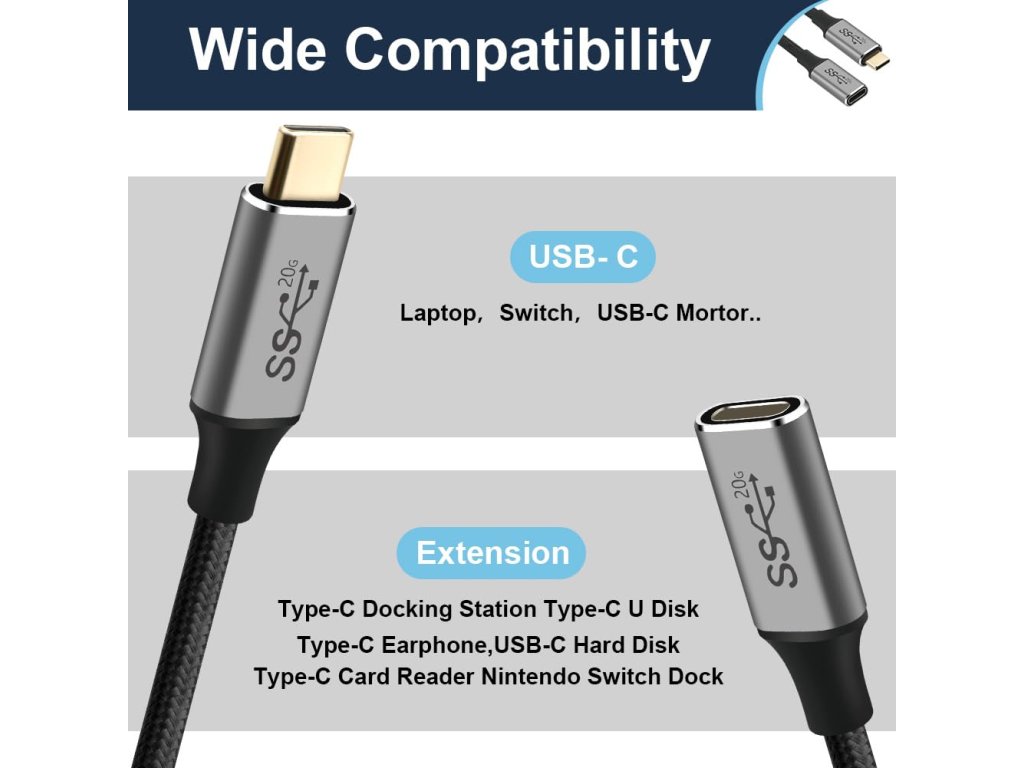 Plnohodnotný prodlužovací USB-C 3.2 kabel s pozlacenými konektory pro přenos dat i obrazu. Generace 3.2 rychlost až 20Gb/s. 4K60hz