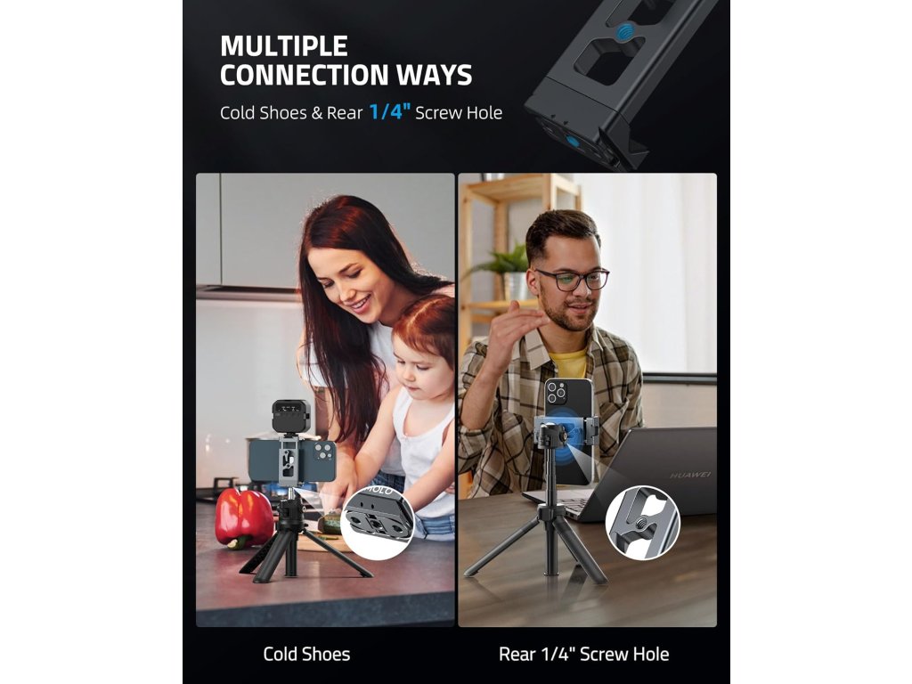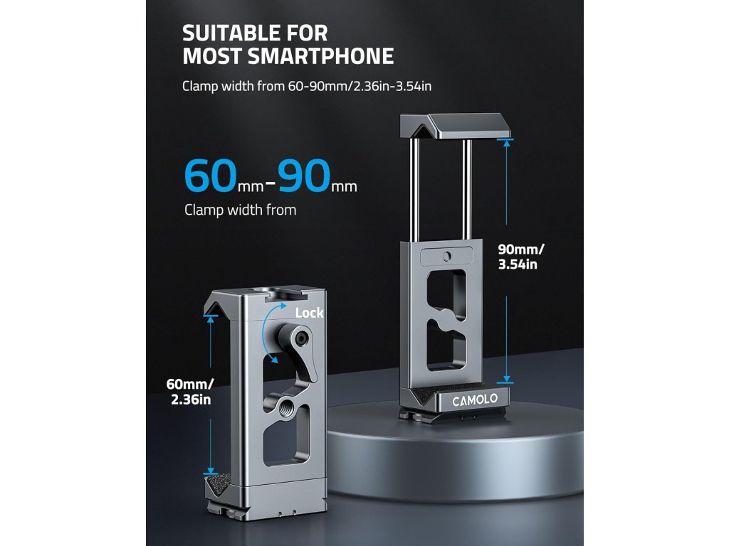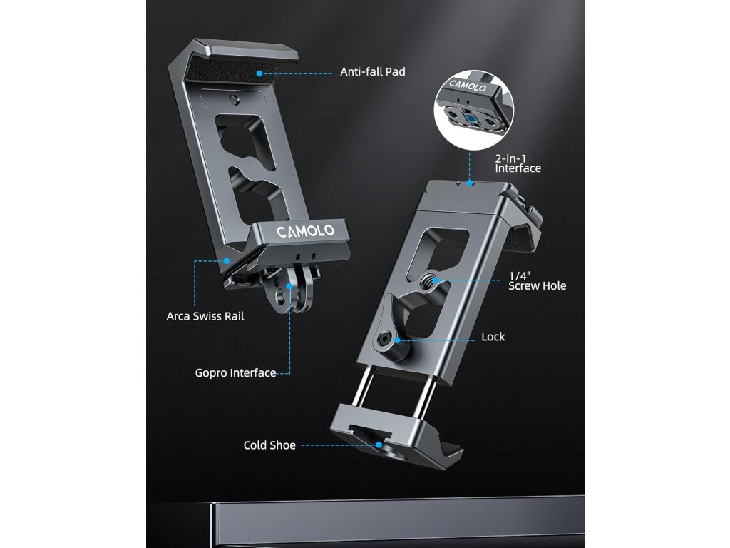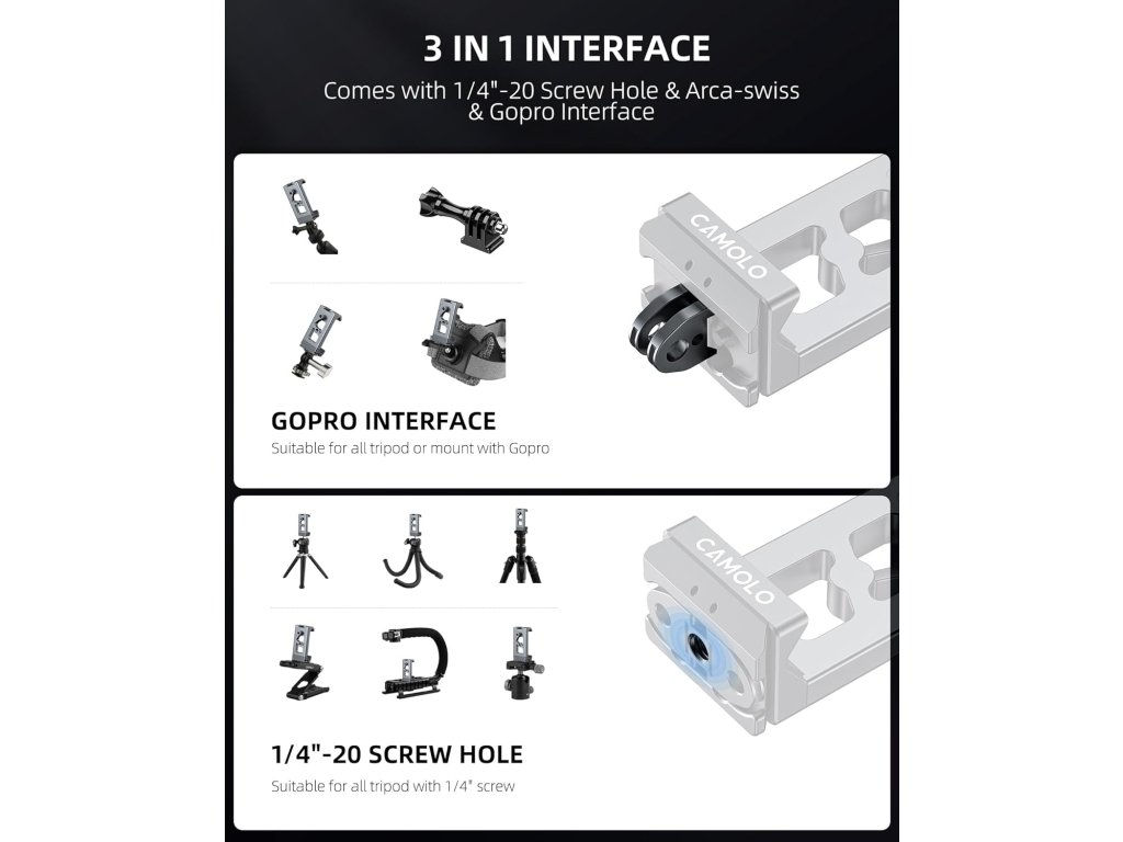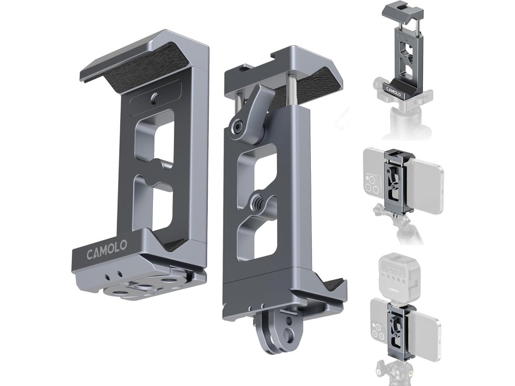 Celokovový držák telefonu je univerzální adaptér, který spojuje tři funkce v jednom: GoPro úchyt, závit 1/4" a Arca-Swiss kompatibilitu. Díky tomu jej snadno využijete na stativech, selfie tyčích, monopodech i s GoPro příslušenstvím. Robustní kovové tělo a protiskluzová guma zajišťují maximální bezpečnost a stabilitu při každém použití.