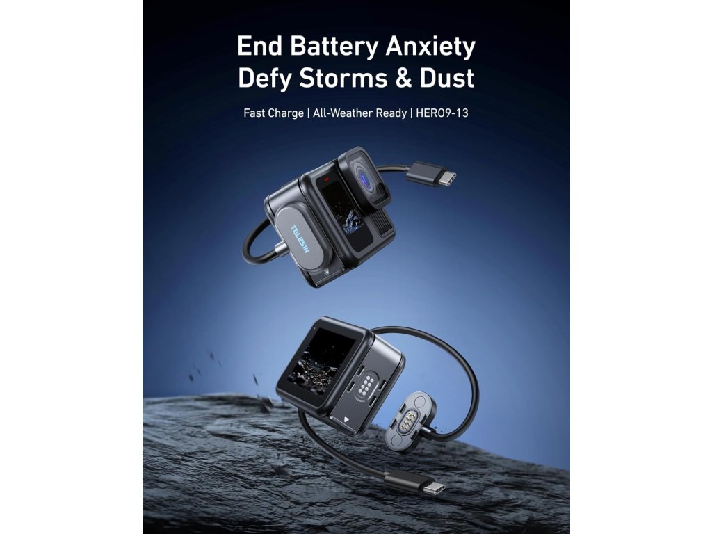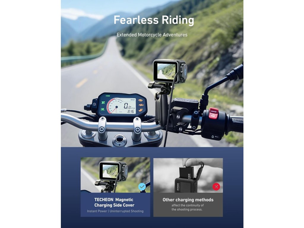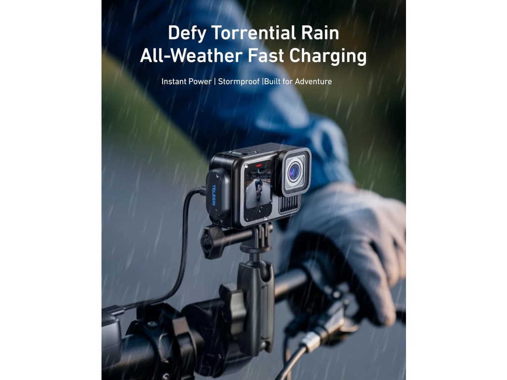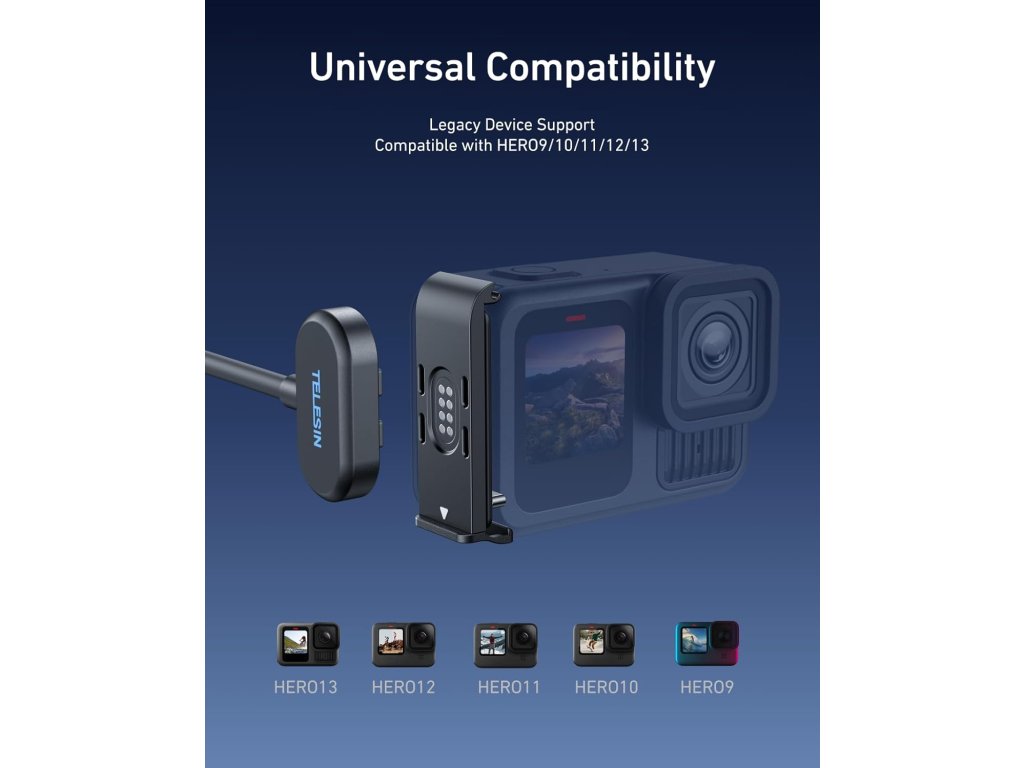 Speciální nabíjecí dvířka TELESIN pro GoPro Hero 9–13 vám umožní napájet kameru i během natáčení v dešti, prachu nebo na motorce. Díky magnetickému systému se připojení vyřeší během 0,02 vteřiny – bez nutnosti kameru otevírat nebo měnit baterii.