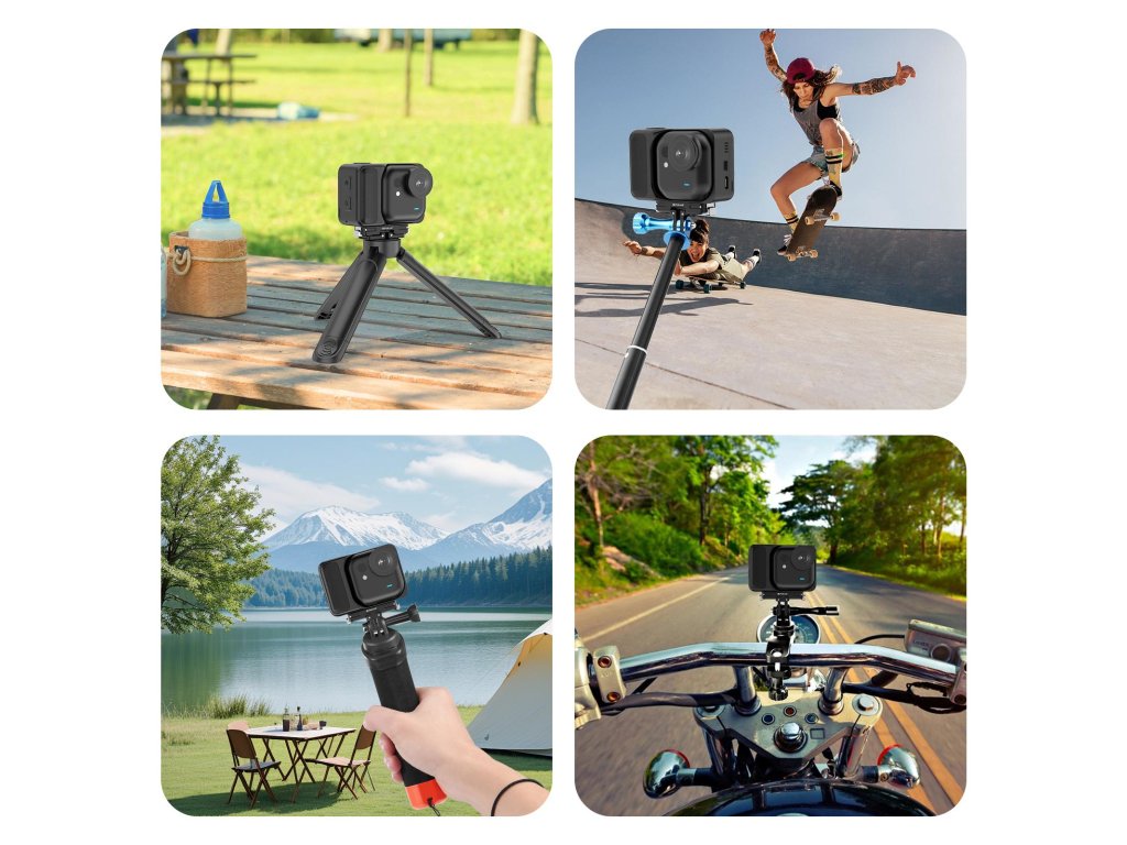 - Široká kompatibilita: spodní část s univerzálním 1/4" závitem a adaptérem pro příslušenství GoPro, stativy, rukojeti i držáky.