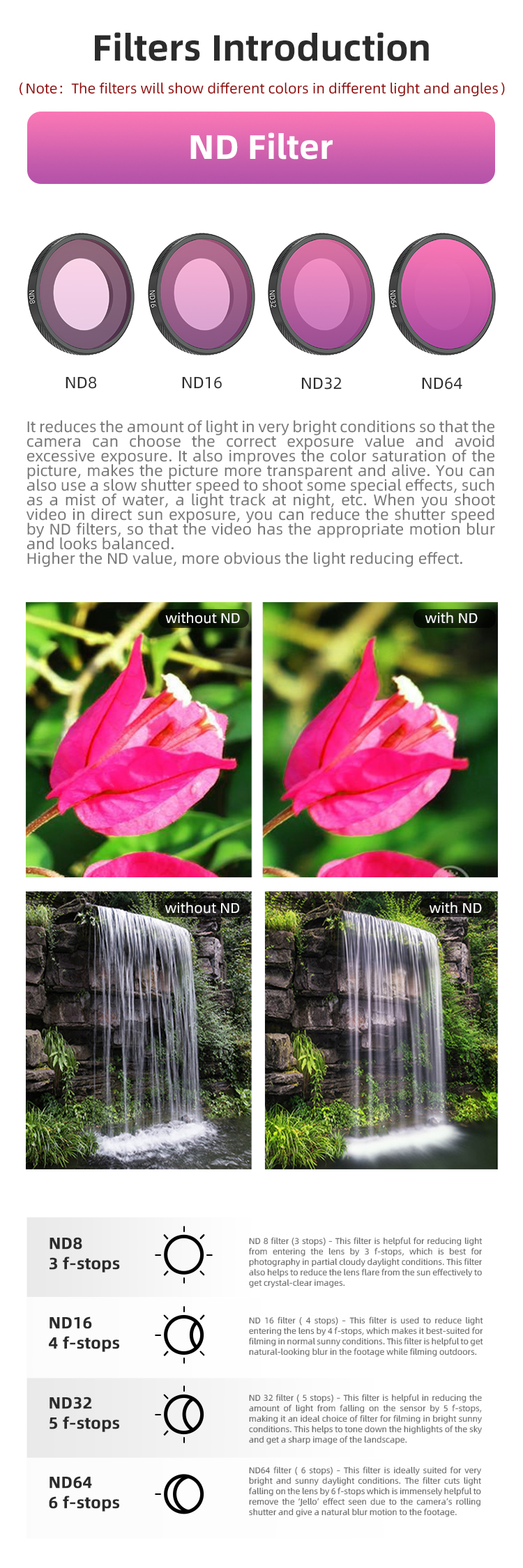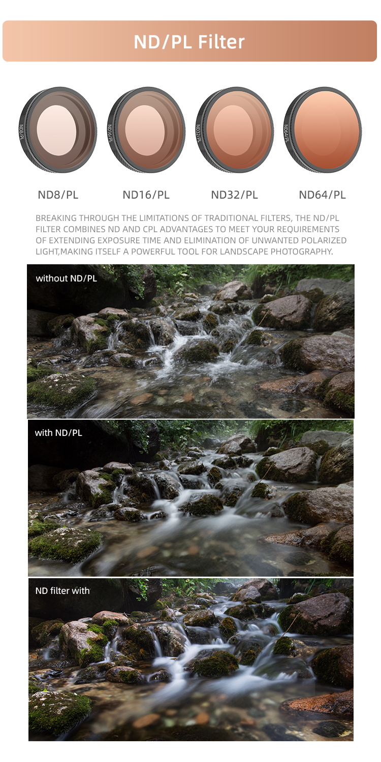 - ND64/PL filtr – nejsilnější redukce světla, perfektní do ostrého slunce nebo pro kreativní dlouhé časy.