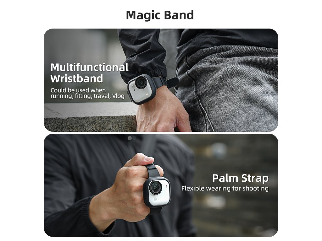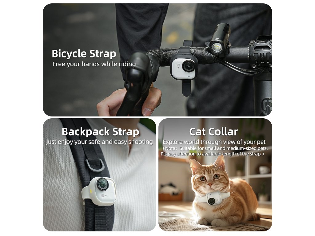 Díky variabilní konstrukci se pásek dokáže proměnit téměř v cokoli – od náramku přes popruh na dlaň, upevnění na batoh či řídítka až po obojek pro domácího mazlíčka. Jediným rychlým zacvaknutím získáte bezpečné a stabilní místo pro kameru v situacích, kdy běžné držáky nejsou po ruce.