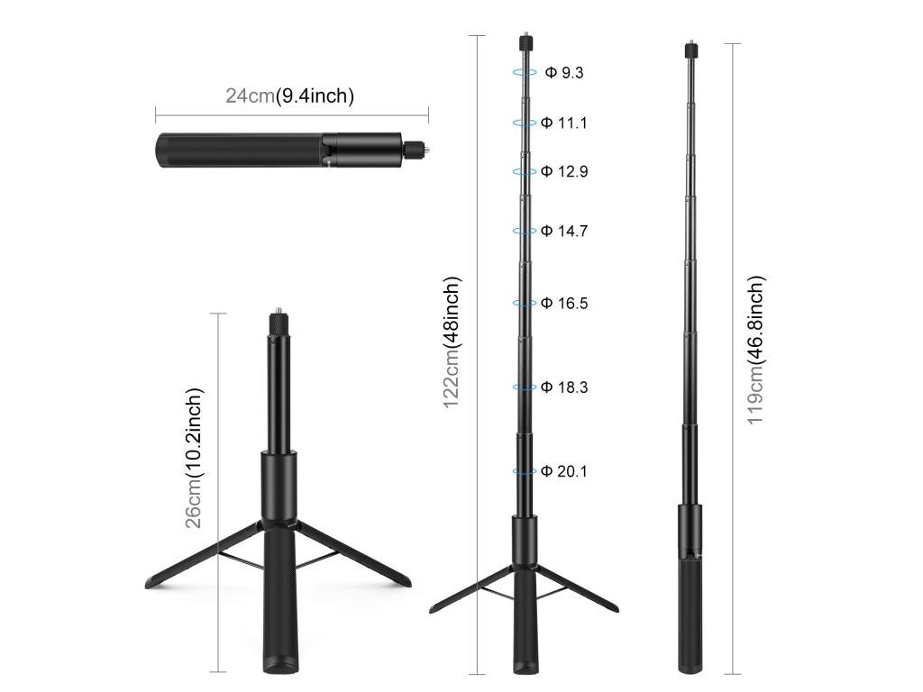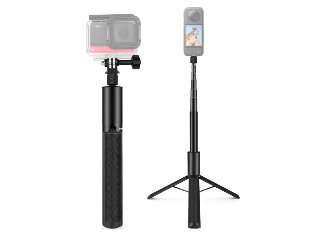 Spárujte tuto selfie tyč s Insta360 X5, ONE X, ONE X2, ONE R nebo EVO a ta na záběrech v 360° režimu vůbec nebude vidět. Dá se složit na 24 cm a roztáhnout až na 119 cm. A když budete potřebovat, jednoduše z ní uděláte i kvalitní stativ.