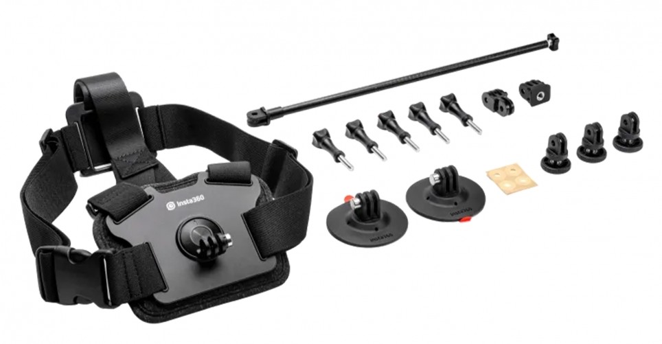Balíček příslušenství pro akční kamery, který je určený pro použití při zimních sportech. Balení obsahuje hrudní popruh a montážní sadu na helmu včetně prodlužovací tyče.