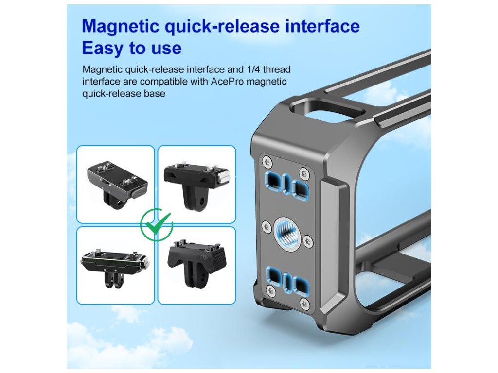 1× ochranný hliníkový rám s magnetickou základnou a dvěma cold shoe úchyty.