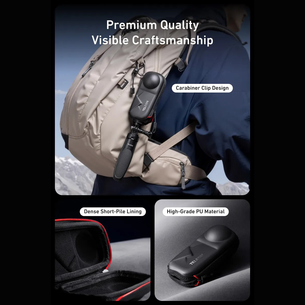 Tvrdý vnější plášť spolehlivě absorbuje nárazy a tlak v batohu, zatímco vnitřní výstelka zabraňuje poškrábání kamery. Praktický otvor ve spodní části umožňuje ponechat kameru nasazenou na selfie tyči, takže ji nemusíte neustále sundávat a znovu montovat. Karabina na boku pouzdra umožňuje připnutí k batohu, popruhu nebo opasku.