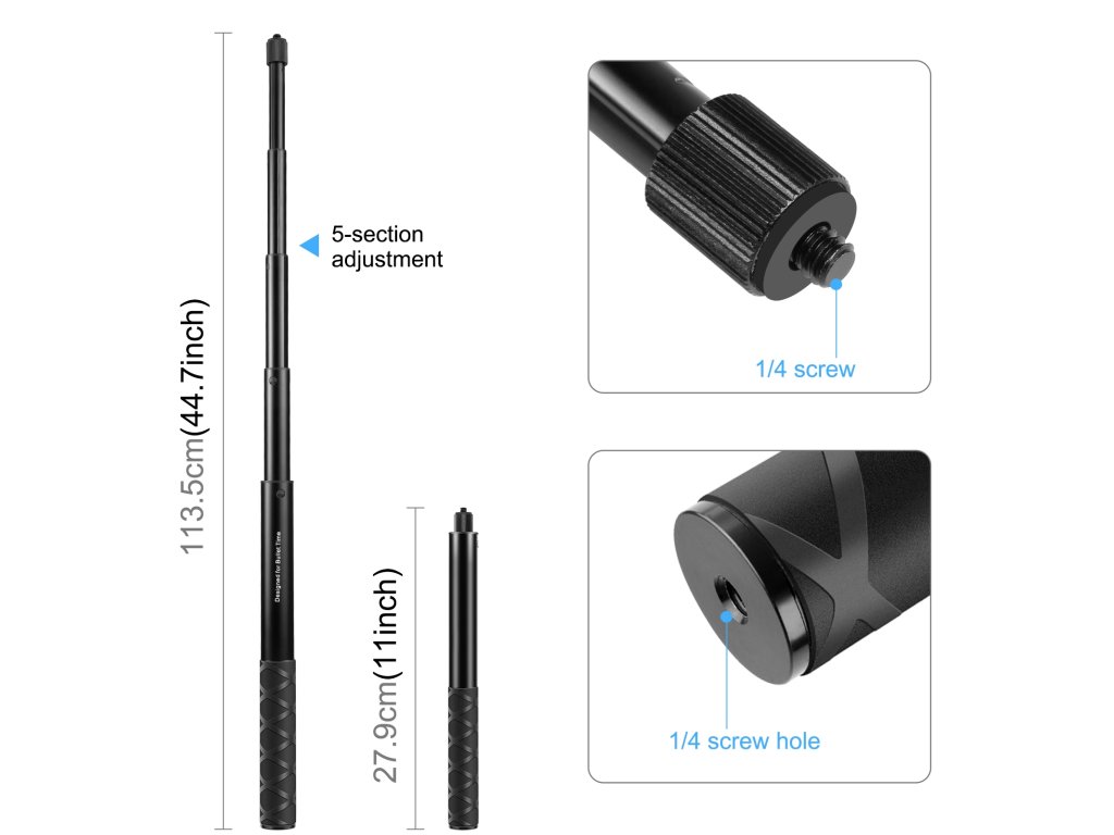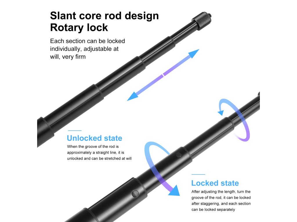 - Teleskopická tyč: nastavitelná délka umožňuje měnit úhel a výšku kamery podle typu záběru.
