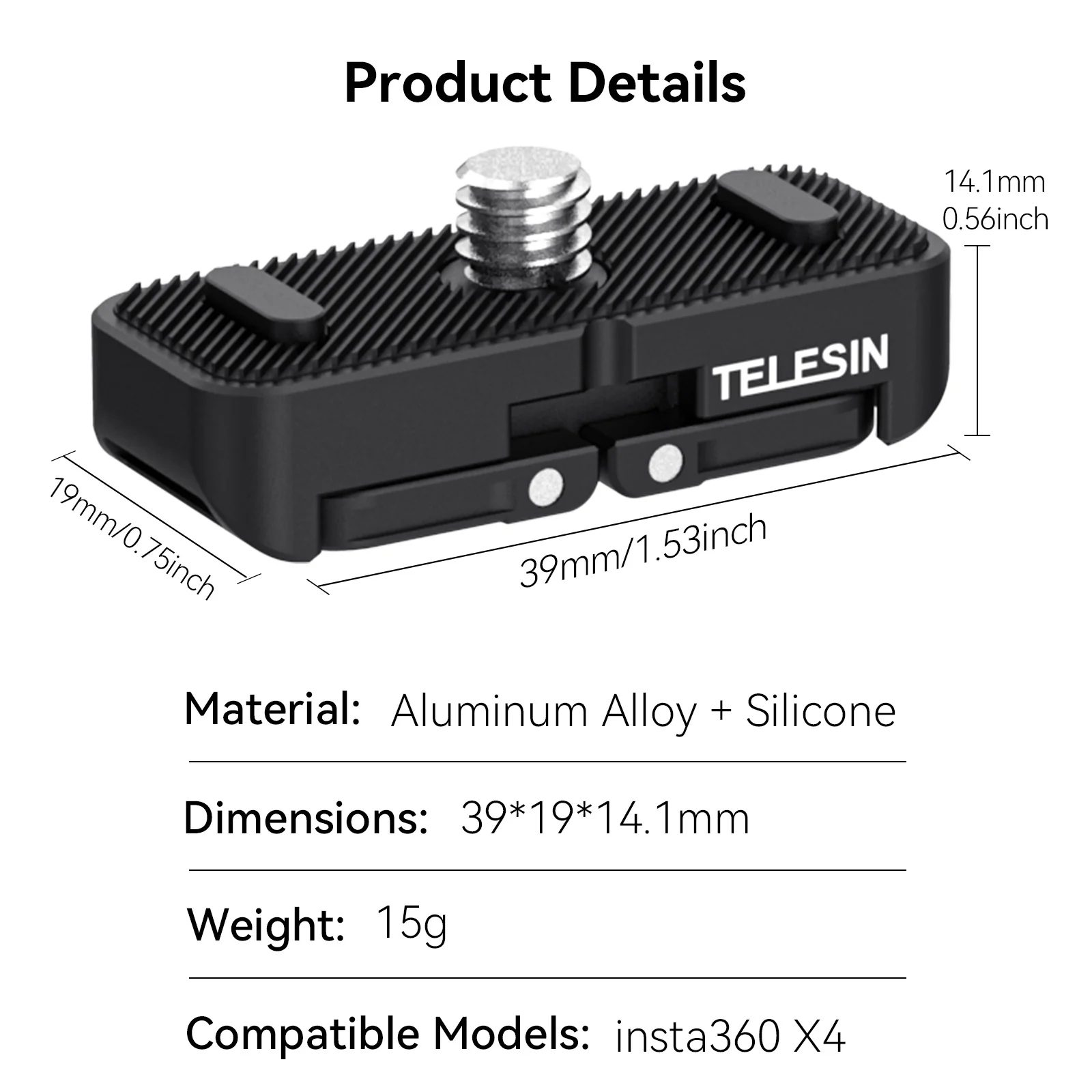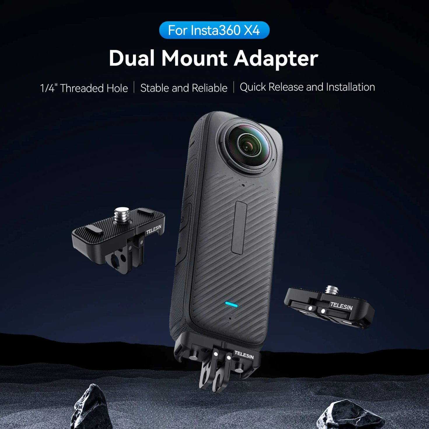 Rychloupínací adaptér TELESIN pro Insta360 X4/X5/ACE PRO 2 vám umožní snadno a rychle přepínat mezi různými typy uchycení – klasický 1/4" závit, dvojzubec nebo DJI Action mount. Díky magnetickému systému a silikonovému tlumení získáte stabilitu a pohodlí při každém použití.