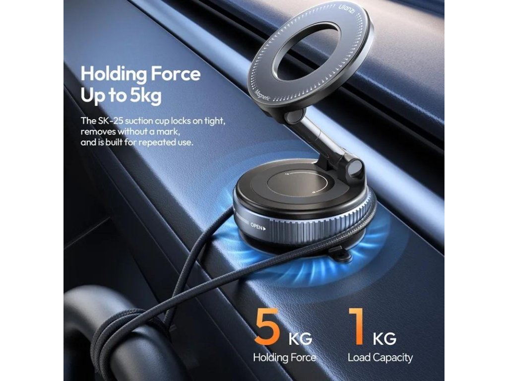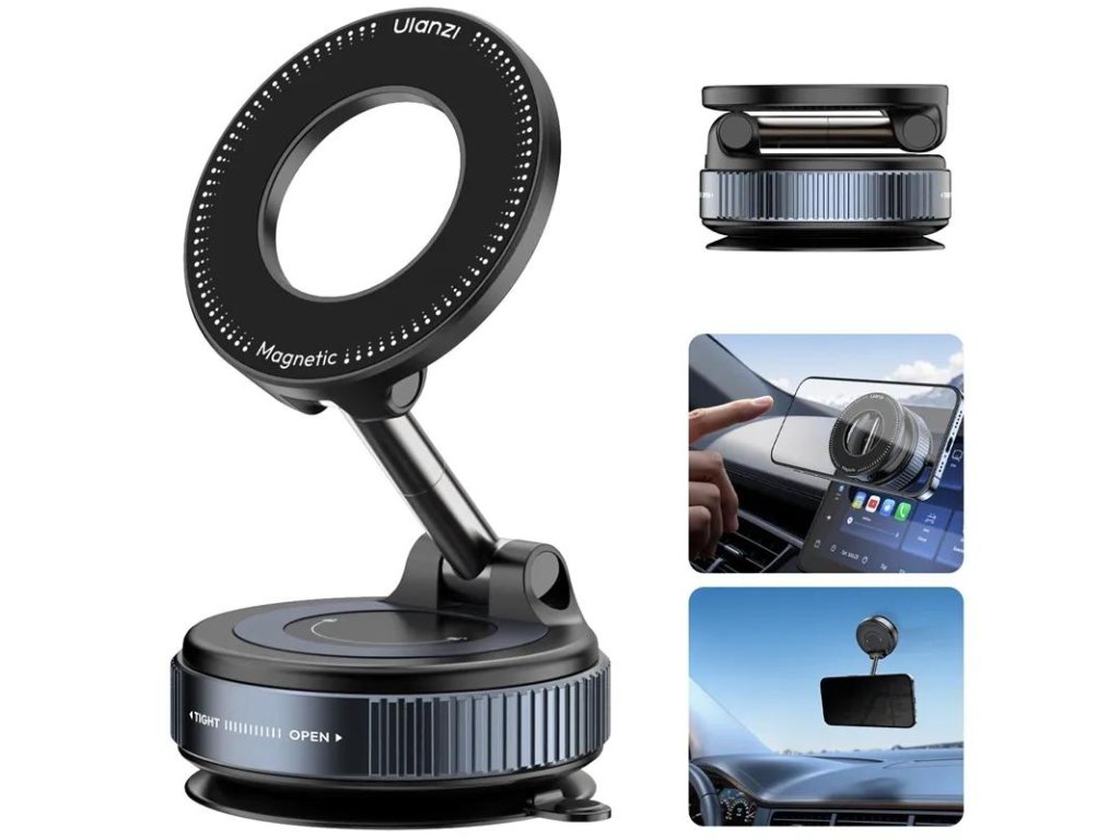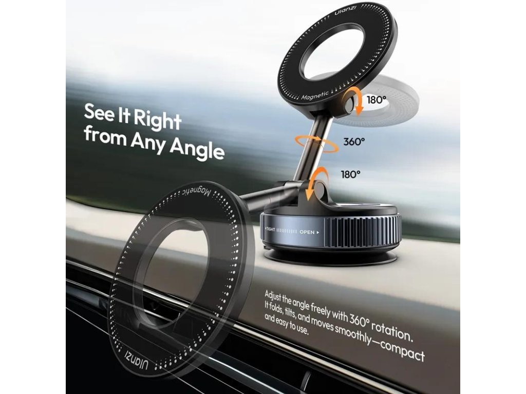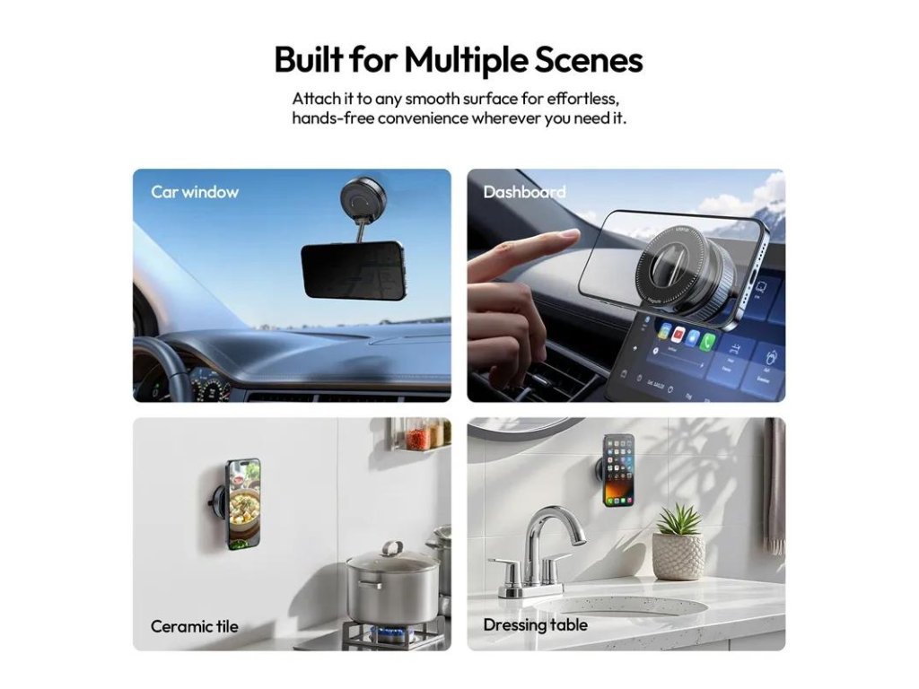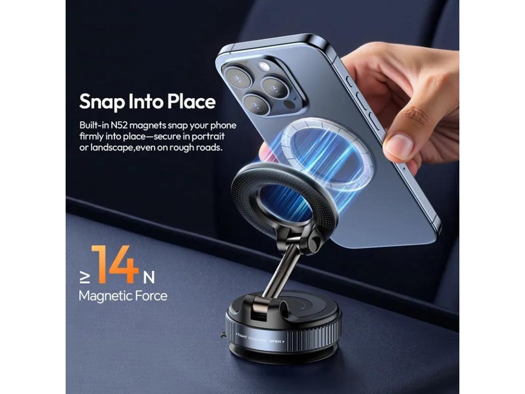 Praktický magnetický držák telefonu s vakuovou přísavkou, který je ideální pro použití v autě, na skle, palubní desce nebo jakémkoli hladkém povrchu. Kombinuje silnou přísavku s magnety kompatibilními s MagSafe, takže mobilní telefon drží bezpečně, aniž by poškozoval povrch nebo padal při jízdě po nerovnostech. Díky otočnému kloubu a snadnému mechanismu uchycení lze telefon nastavit přesně podle vaší potřeby a natočit do libovolného úhlu.