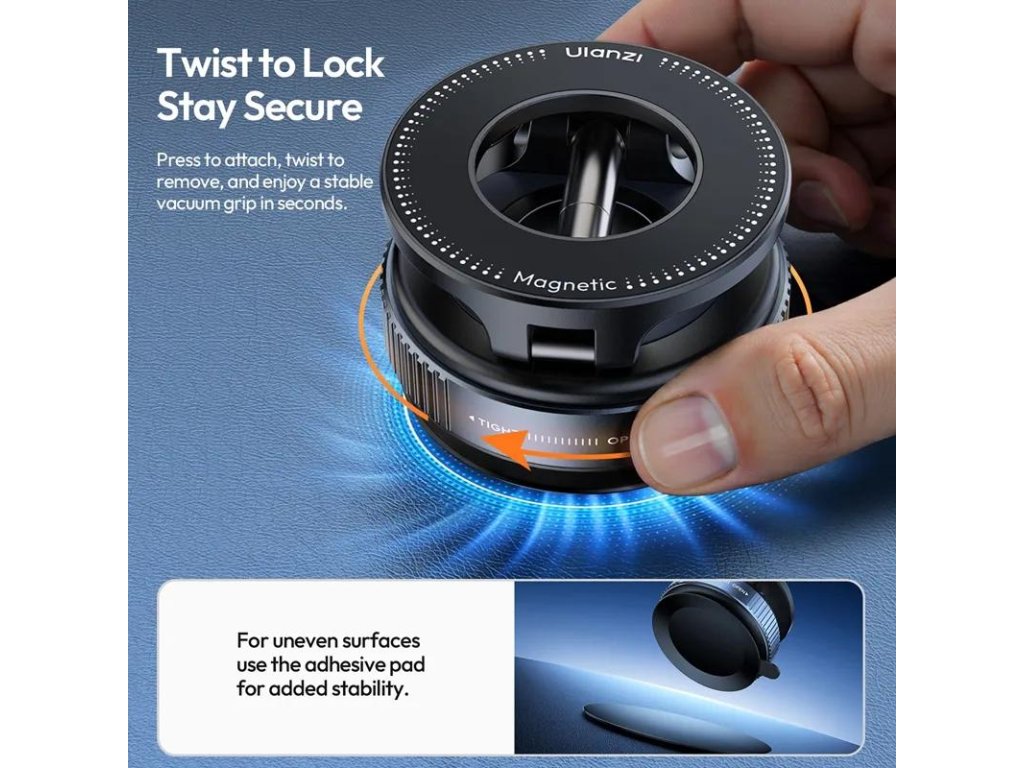 Jednoduchý „twist to lock“ systém znamená, že přísavku připevníte a uvolníte během okamžiku – stačí ji přiložit a zatočit, aby vytvořila silné vakuum. Vestavěné magnety s vysokou sílou udrží telefon spolehlivě na místě, a to jak v portrétním, tak horizontálním režimu. Pokud váš telefon nemá MagSafe, přiložený magnetický kroužek to snadno vyřeší.