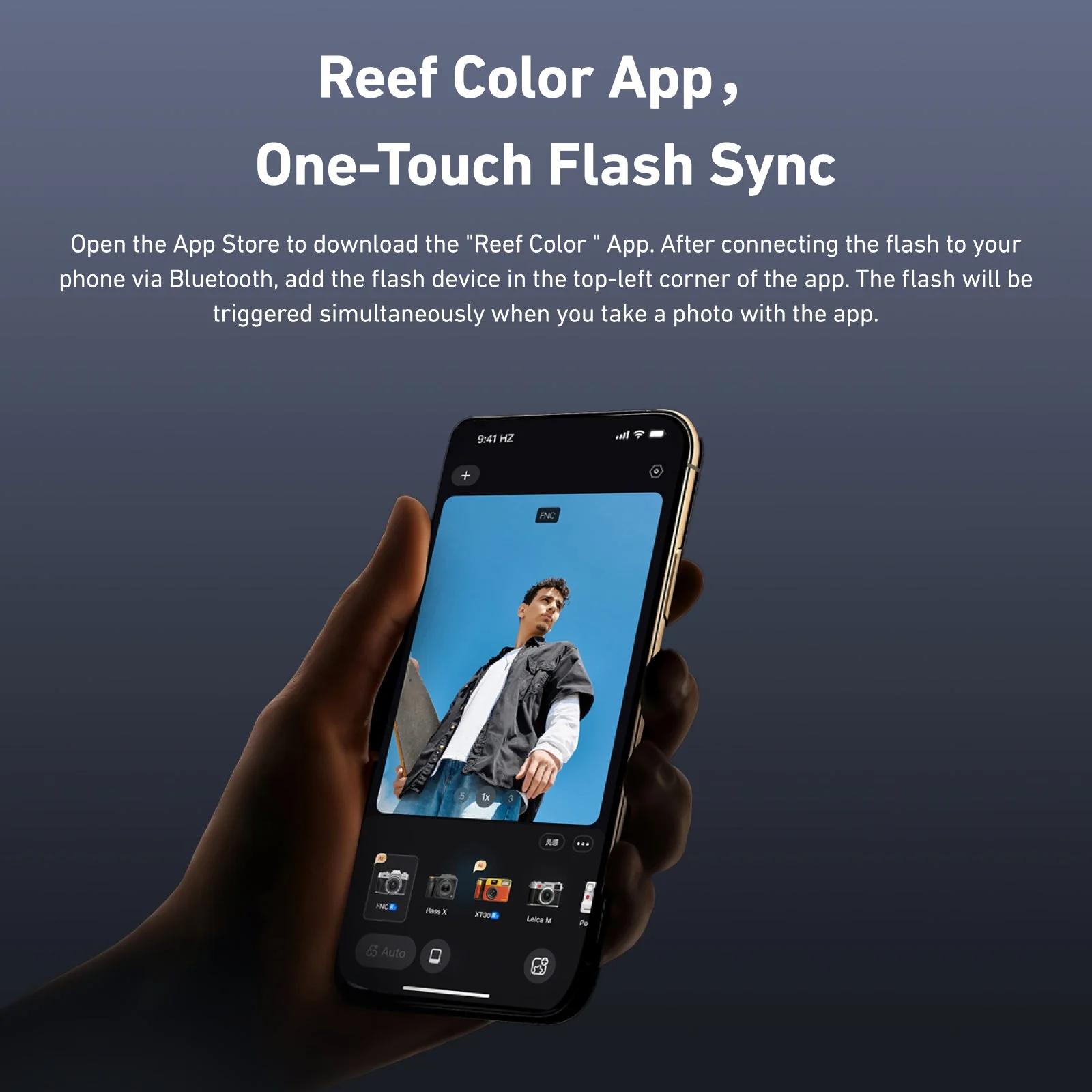 - Ovládání přes aplikaci: pomocí aplikace Reef Color lze blesk spouštět synchronně – po připojení přes Bluetooth se zařízení přidá v aplikaci a blesk se spouští při focení v aplikaci.