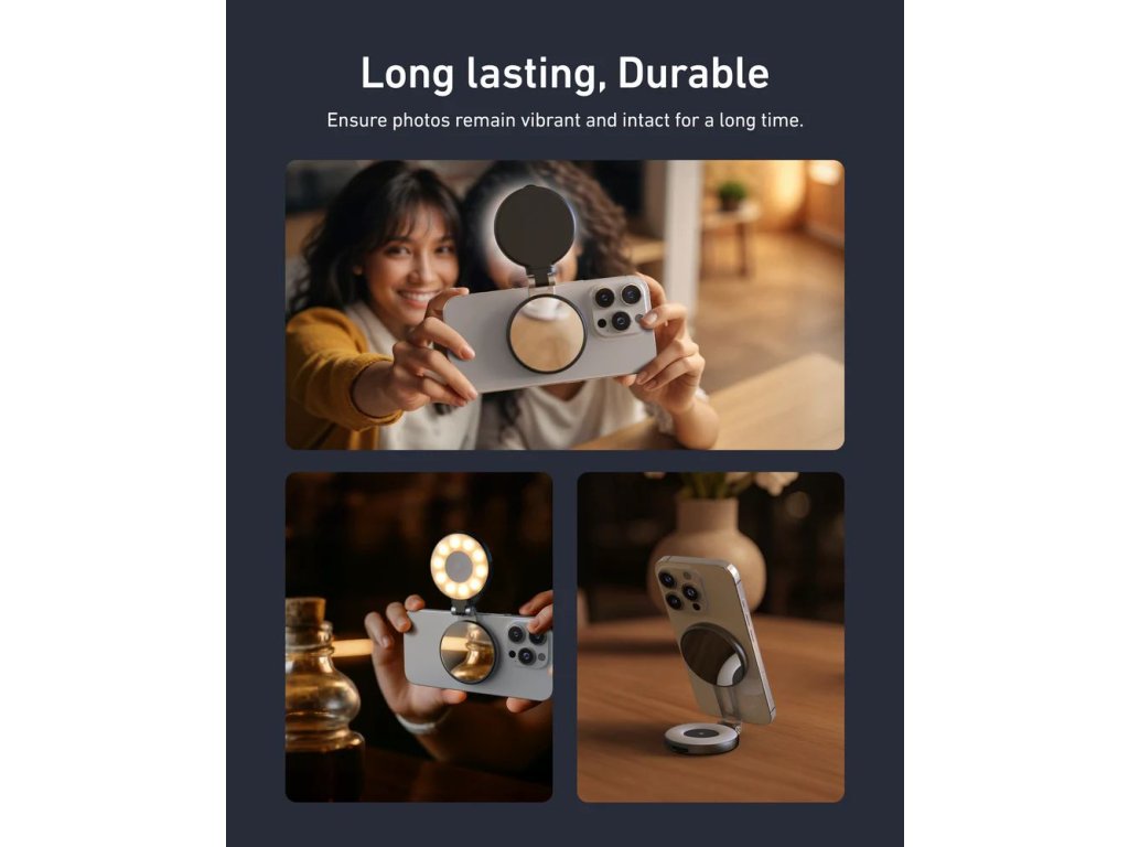 - Možnost upevnění na stativ: spodní magnetická plocha se závitem umožní stabilní použití i mimo telefon.