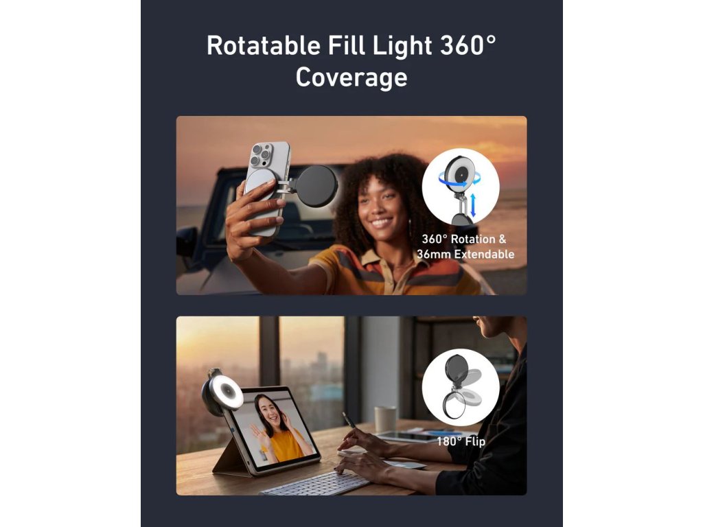 - Univerzální využití: připevněte jej na mobil, tablet, notebook nebo postavte na stůl při natáčení, focení či videohovorech.