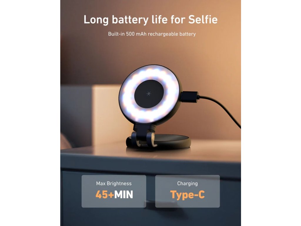 - Dobíjecí baterie: integrovaný akumulátor 500 mAh s USB-C nabíjením vydrží až několik hodin svícení.