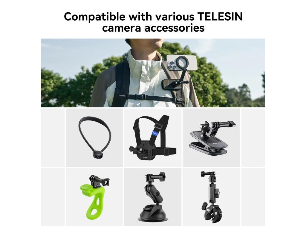 - Kompatibilita s příslušenstvím: funguje s nákrčními držáky, hrudními popruhy, klipy na batoh, přísavkami do auta i trubkovými držáky.