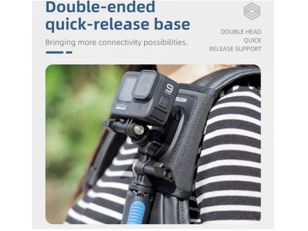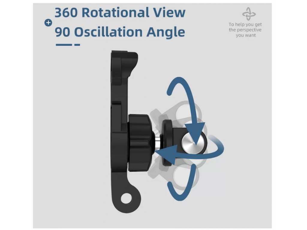 Destička s rychloupínací systémem GoPro s kulovou hlavou. Nastavení rotace kloubu o 360 stupňů a o 90 stupňů do stran. Aretační kolečko pevně a pohodlně zajistí nastavený úhel. Ve spodní části pak najdete další standartní uchycení GoPro pro příslušenství, jako je selfie tyč, tripod nebo stativ. Základnu rychloupínací destičky můžete připevnit na přilbu, hrudní pás a nebo čelenku.