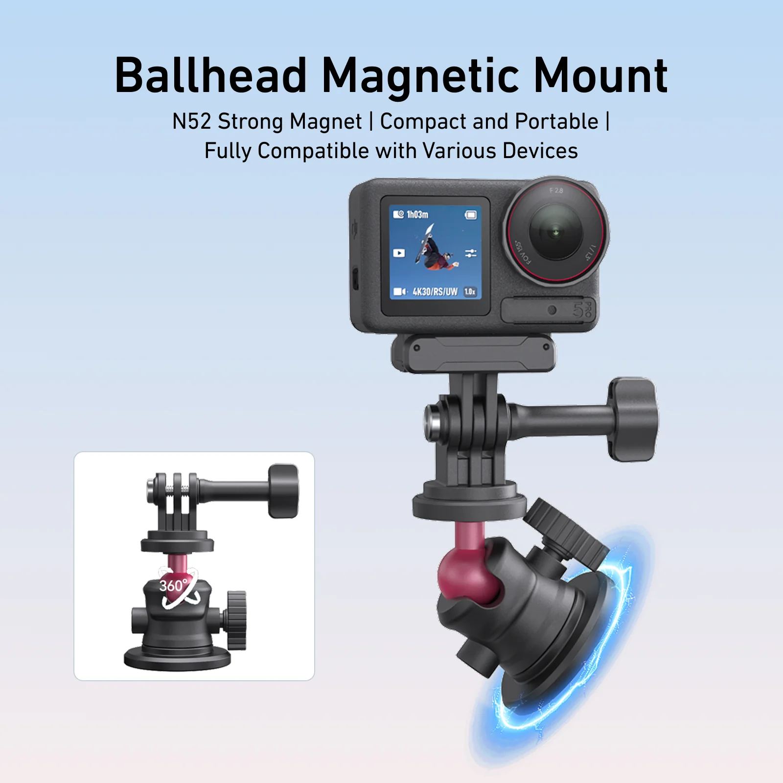 - Rychlé připojení kamery: kompatibilní s GoPro, Insta360, DJI Osmo Action, TELESIN a dalšími kamerami se standardním adaptérem.
