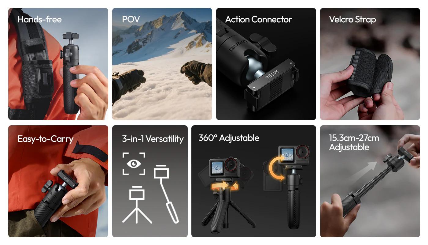 Majitele akčních kamer (včetně řady Action 5 Pro/4/3 a DJI OSMO 360), kteří chtějí mít jeden kompaktní systém pro natáčení z ruky, ze stolu i z popruhu batohu. Skvělé pro cestování, outdoorové aktivity, vlogování, sportovní záběry i každodenní POV videa bez složitého nastavování.