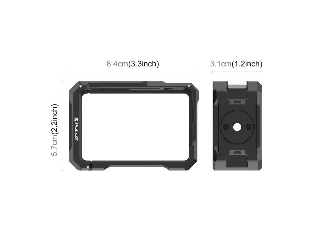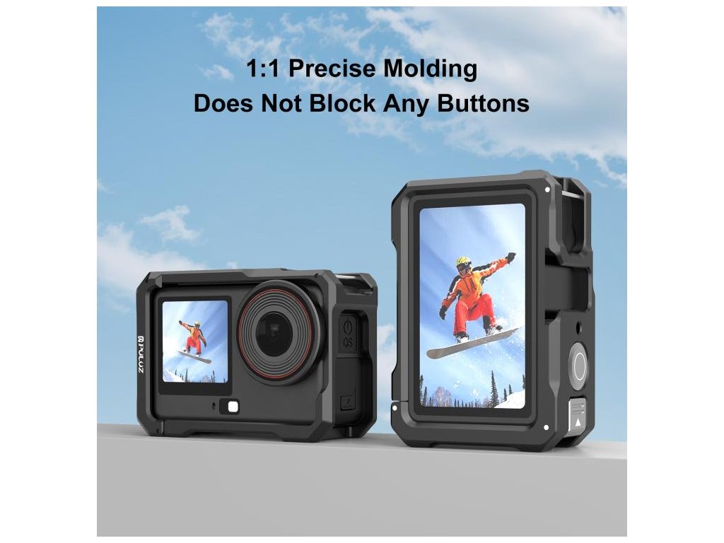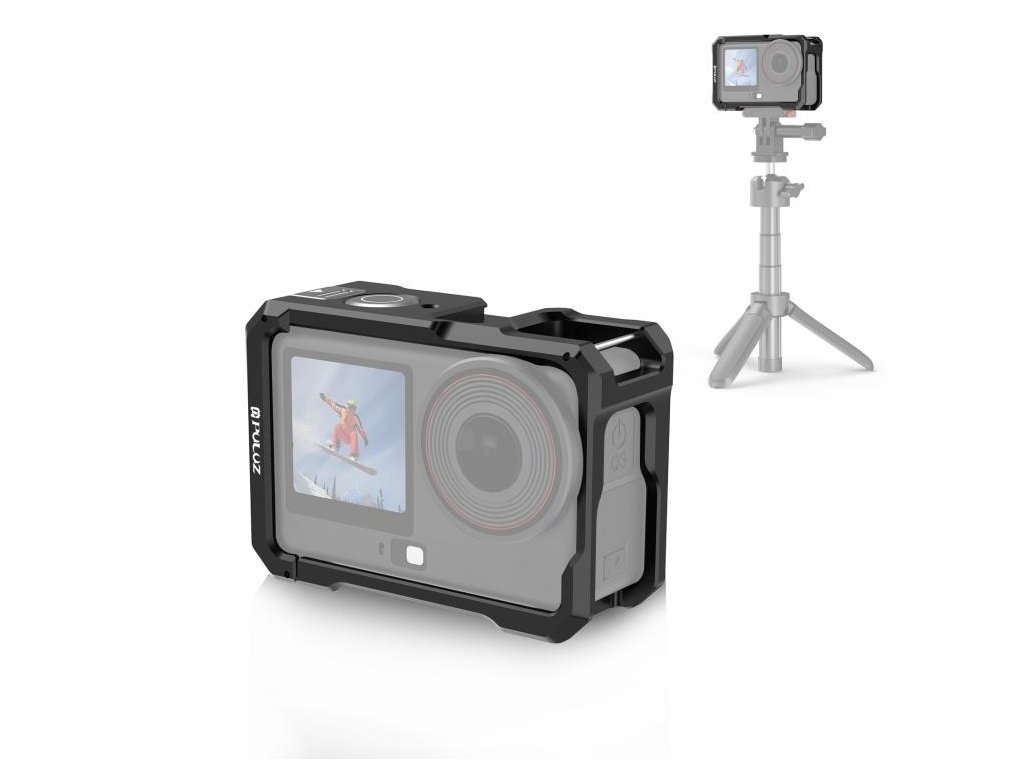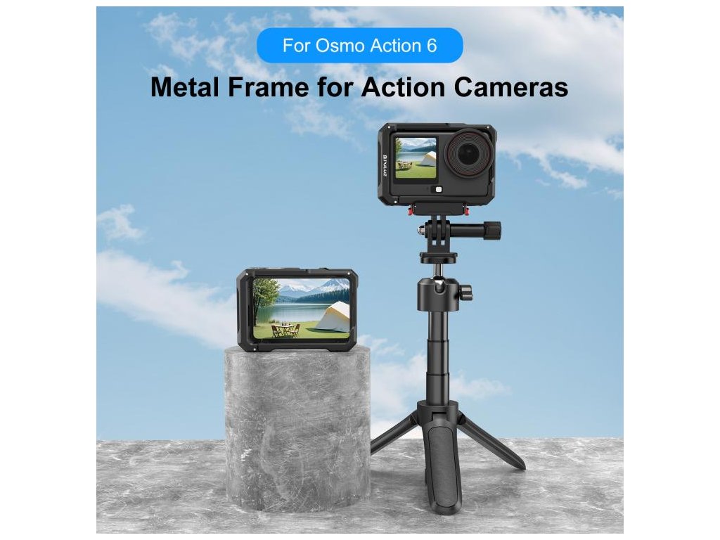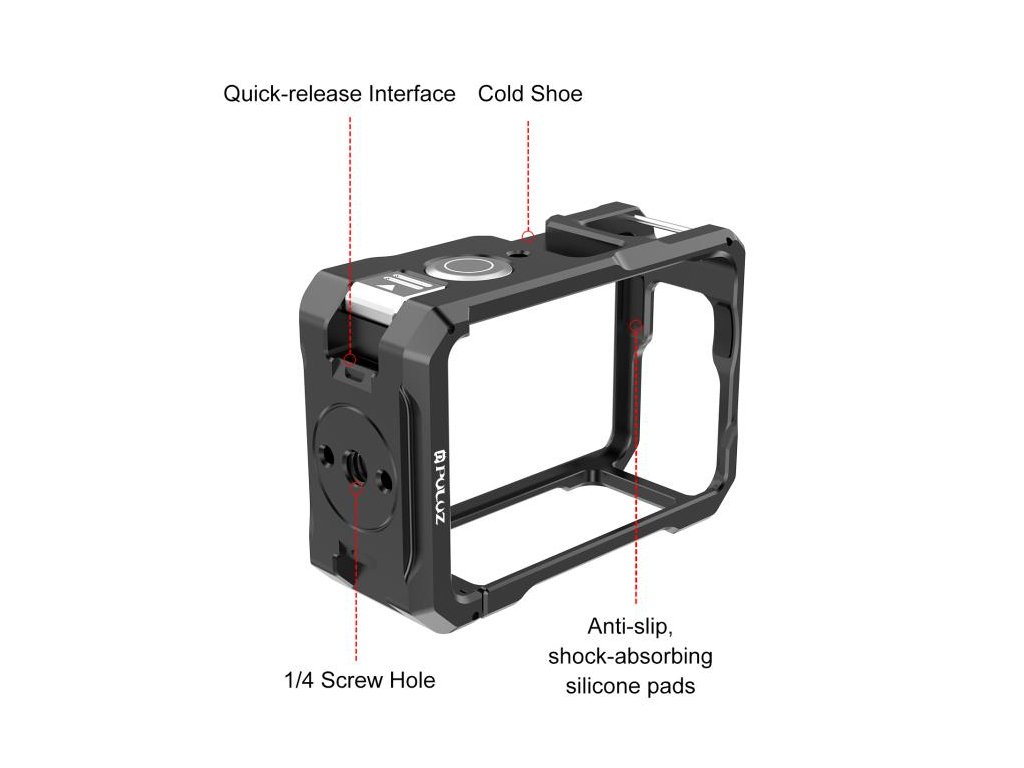 Ochranná hliníková klec pro DJI Osmo Action 6 (černá) se sáňkami (cold shoe), závitem a bočním Action quick-release uchycením pro vertikální natáčení.