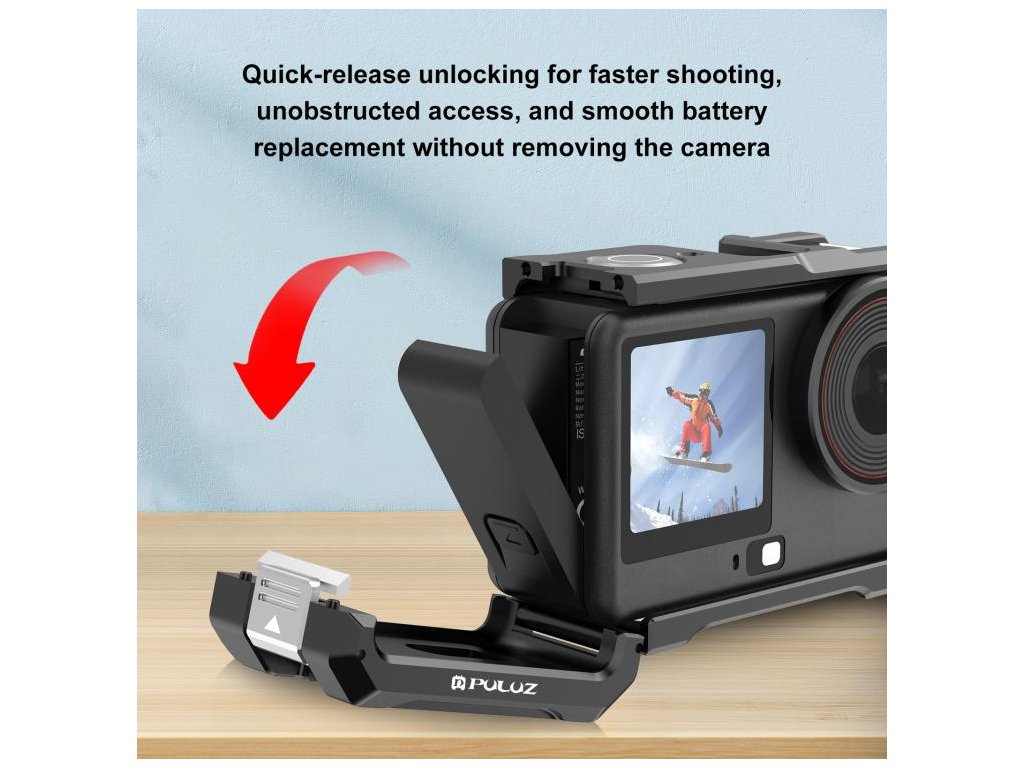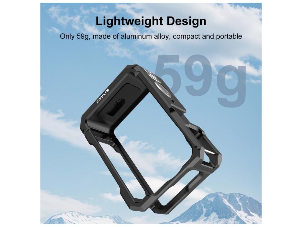 Klec je vyrobená z leteckého hliníku, takže je lehká, pevná a připravená na běžné nárazy i tvrdší zacházení v terénu. A bonus navíc: díky sáňkám (cold shoe), závitu a možnosti vertikálního uchycení si z akční kamery snadno uděláte malou sestavu na natáčení (bez toho, aby výměna baterie znamenala malé technické drama).