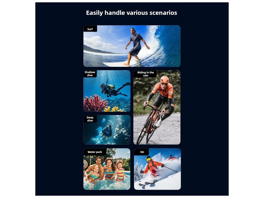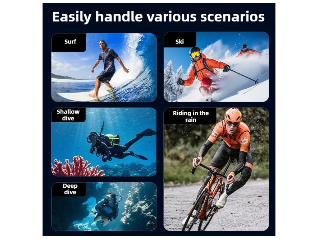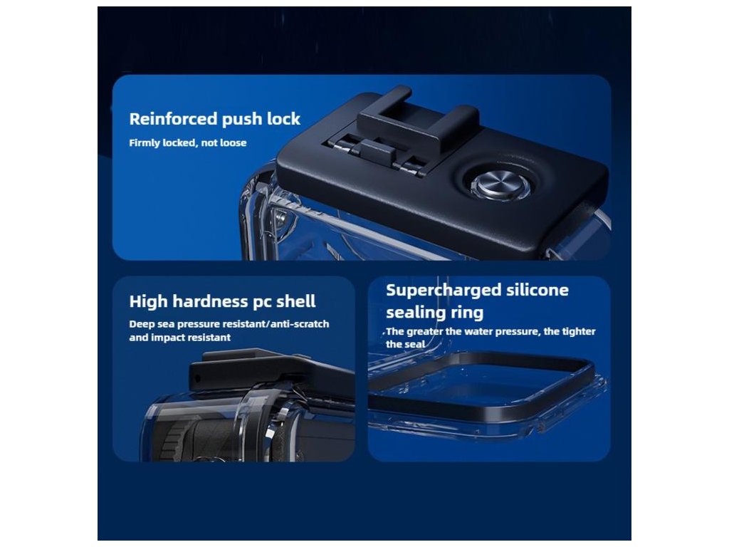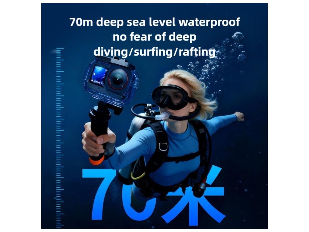 Potápění, šnorchlování a podvodní natáčení do hloubky 70 m, ale také pro akční situace, kde chcete kameru chránit před vodou, nárazy, prachem a poškrábáním. Díky cold shoe se hodí i pro sestavy, kde používáte přisvětlení.