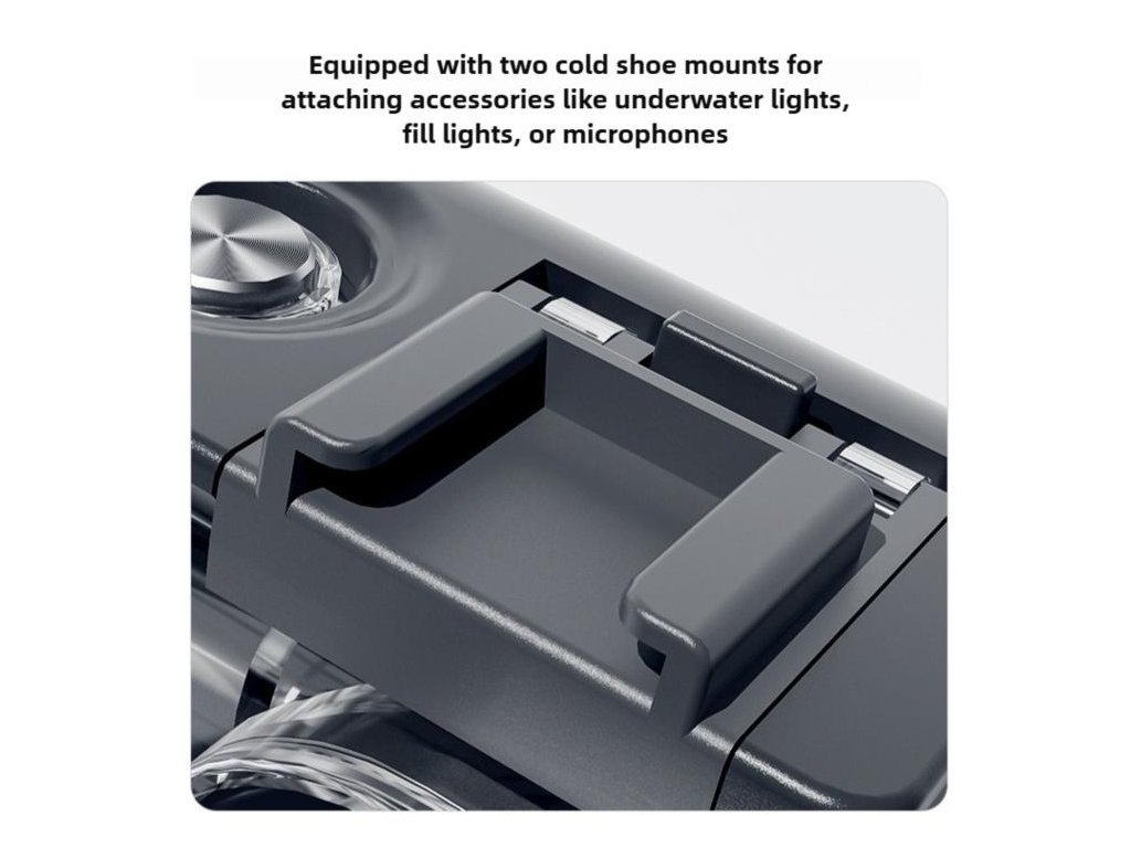 Pouzdro je vyrobené z kvalitního PC materiálu a skla pro dobrou odolnost a čistý obraz. Kromě vody chrání kameru i před běžnými riziky při outdooru – nárazy, prachem nebo poškrábáním. Na horní straně je navíc cold shoe pro připojení příslušenství, například světla.
