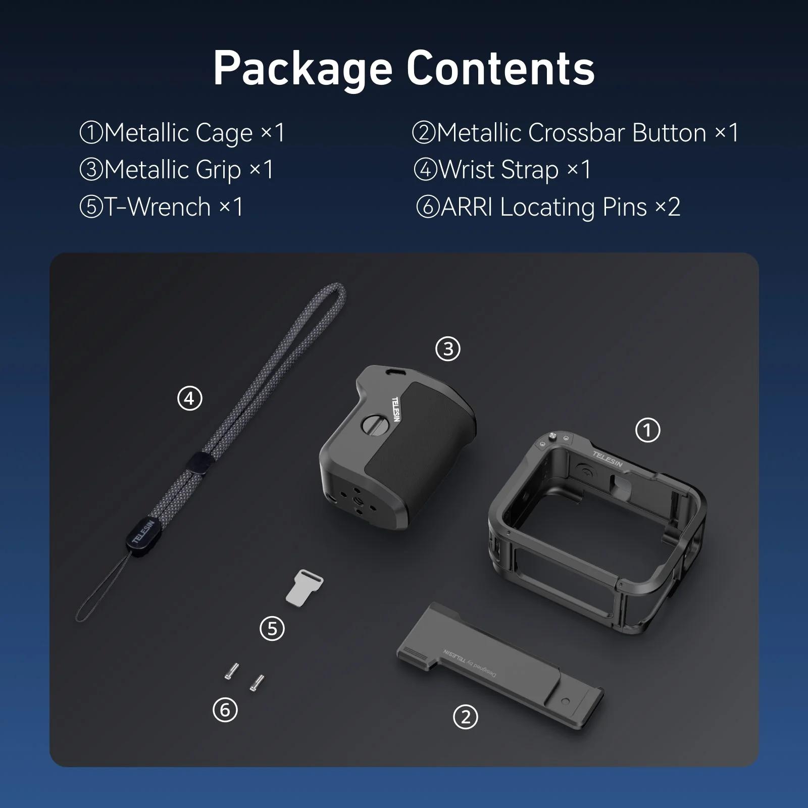 Obsah balení: 1× kovový ochranný rám, 1× kovové madlo, 1× kovové příslušenství (crossbar button), 1× poutko na ruku, 1× T-klíč, 2× ARRI polohovací piny