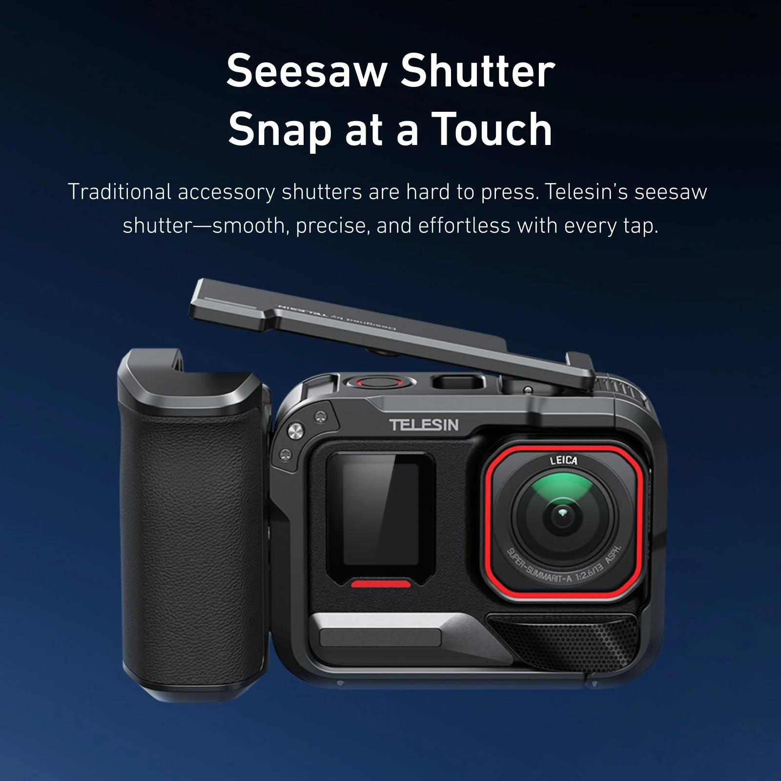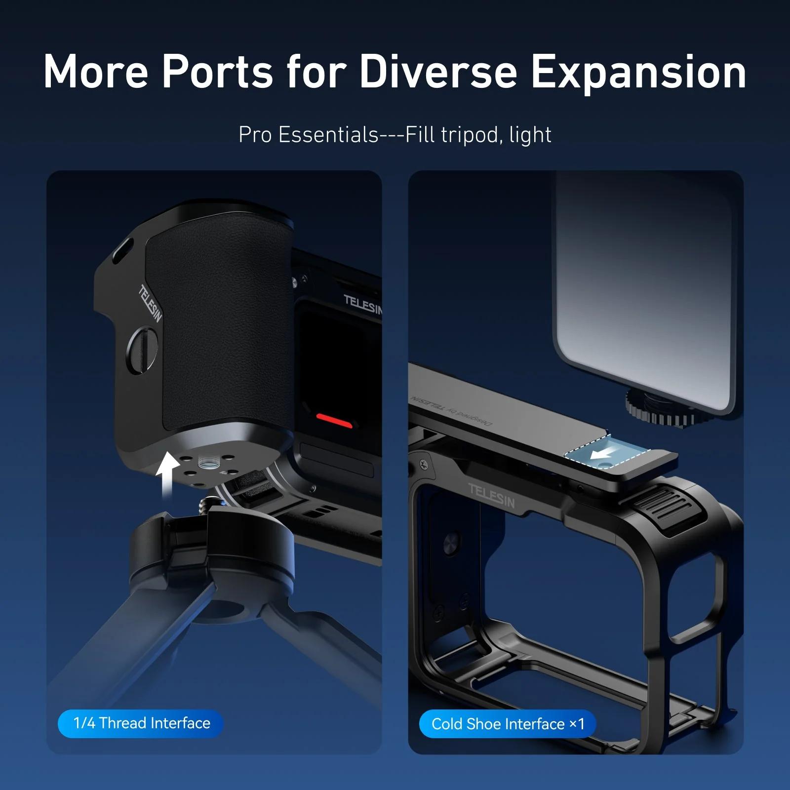 TELESIN StreetGrip Kit pro Insta360 Ace Pro / Pro 2 je kombinace hliníkového ochranného rámu a ergonomického bočního madla, která z akční kamery udělá mnohem jistější nástroj na natáčení z ruky. V ruce to působí víc jako kompaktní foťák - lepší úchop, stabilnější záběry a rychlejší práce při focení i videu.